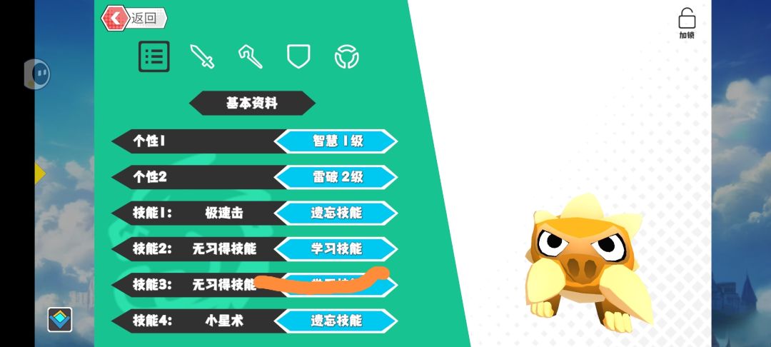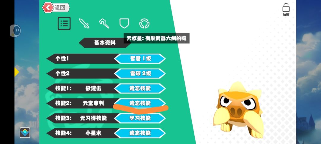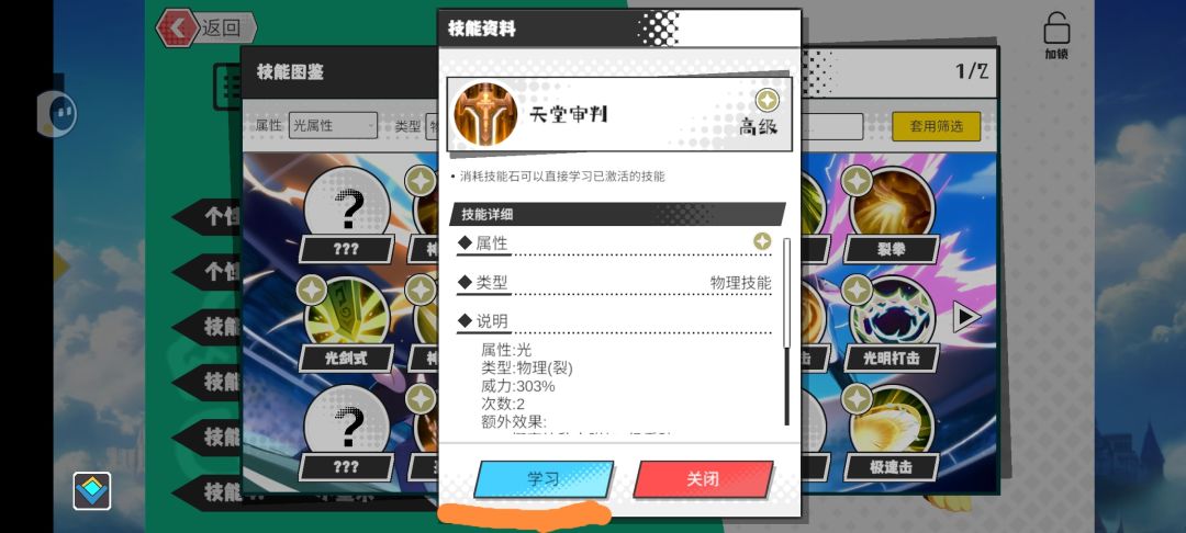 技能学习,比如我的这个小獠牙猪,他本身没有光系物理技能,我想给他学个天堂审判