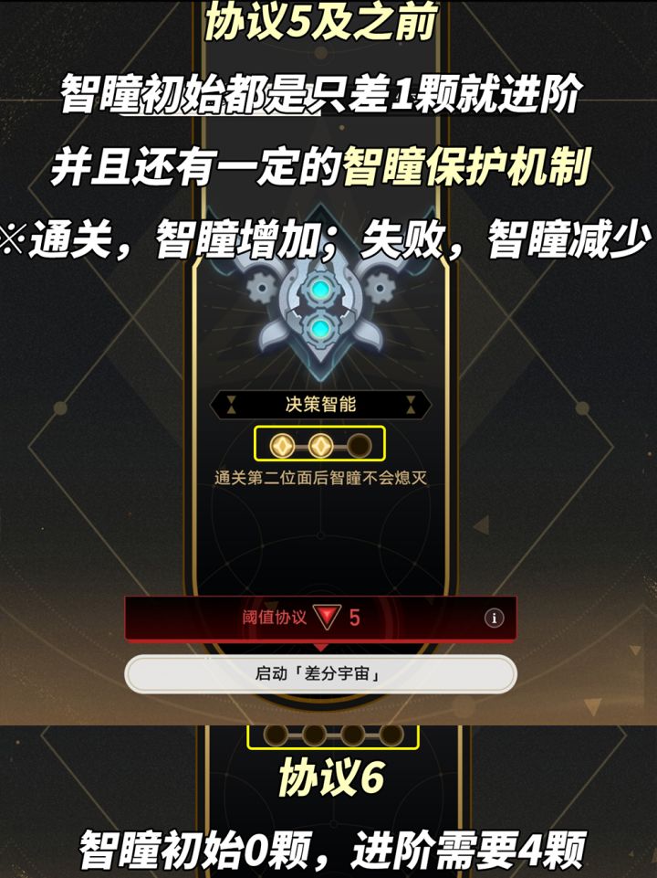旧差分宇宙的折磨难度是自选难度,新版则对玩法做了些许改动。通关成功会获得智瞳,智瞳充满后进阶下一星阶;通关失败则会减少智瞳。