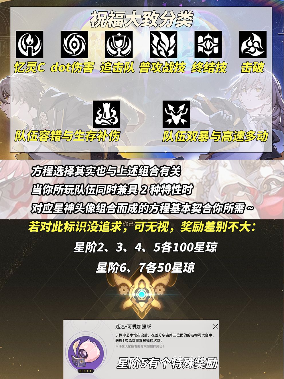 ①6种体系指定buff。记忆,忆灵C;虚无,dot伤害;欢愉,追击队;繁育,普攻战技频繁;智识,终结技频繁;同谐,击破队。