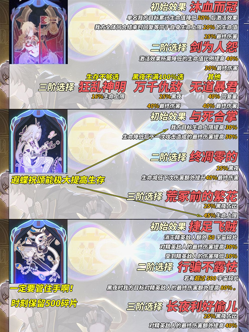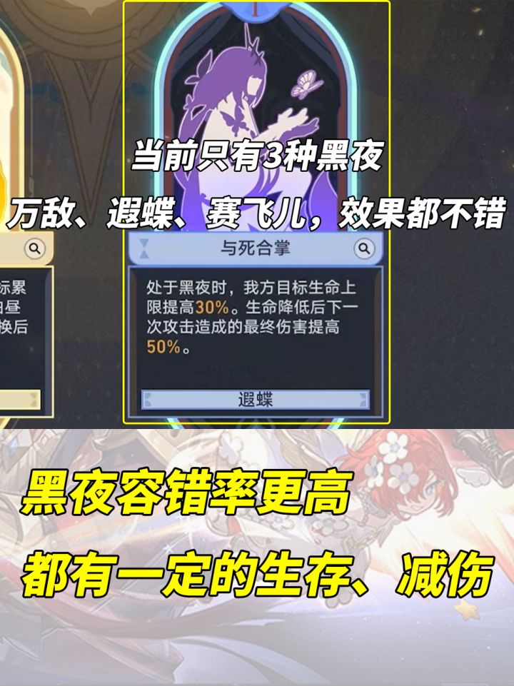 【遐蝶祝颂】初始一阶,与死合掌(30%生命上限+生命减低下次伤害提升40%最终伤害);二阶,终凋零的(25%黑夜占比+生命减低下次伤害额外提升40%最终伤害);三阶,荒冢前的繁花(25%黑夜占比+45%生命上限)。