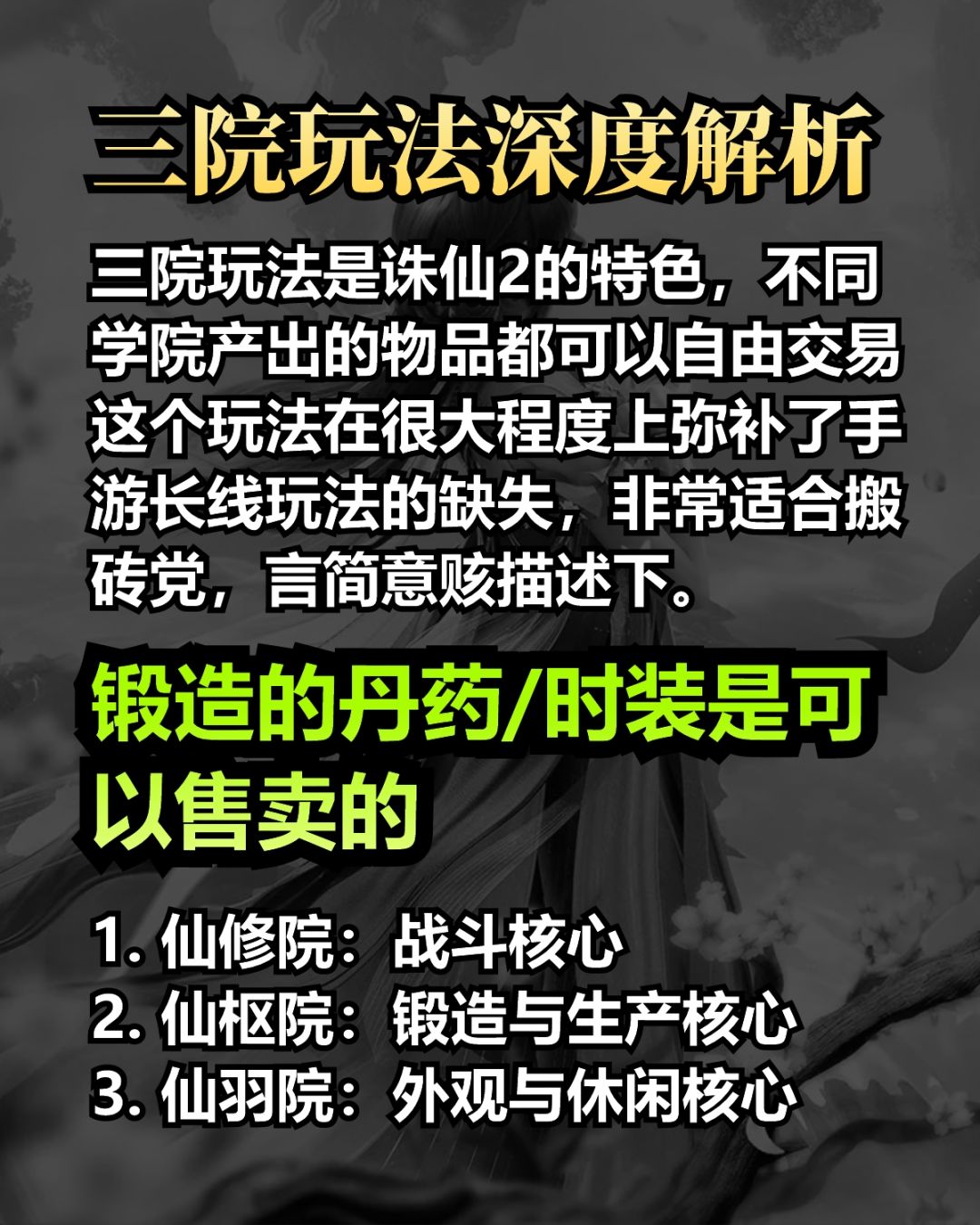Ps:三院玩法是诛仙2的特色,不同学院产出的物品都可以自由交易,这个玩法在很大程度上弥补了手游长线玩法的缺失,非常适合搬砖党。