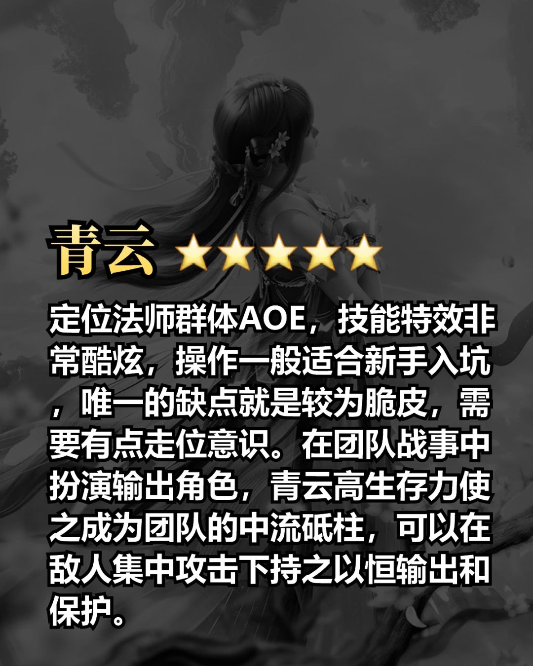 定位法师群体AOE,技能特效非常酷炫,操作一般适合新手入坑,唯一的缺点就是较为脆皮,需要有点走位意识。在团队战事中扮演输出角色,青云高生存力使之成为团队的中流砥柱,可以在敌人集中攻击下持之以恒输出和保护。