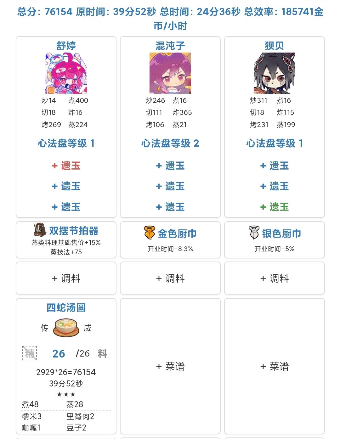 由于部分厨师技能影响,这时菜谱效率排名可能发生变化,这时再点击菜谱进行检验,确认菜谱没变化就是最高效率。
