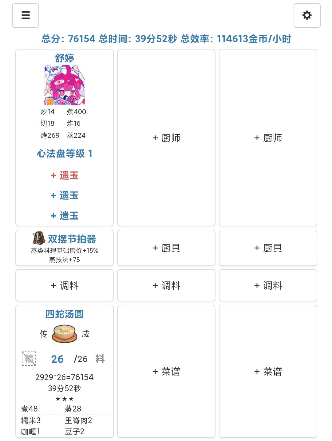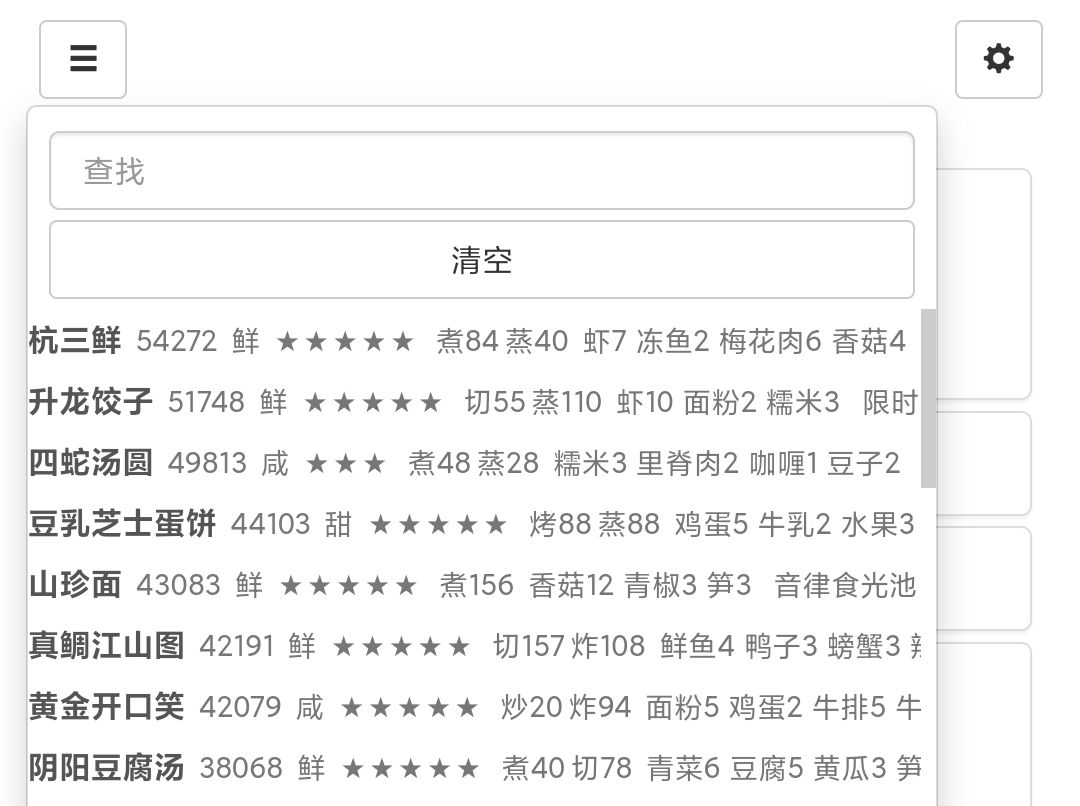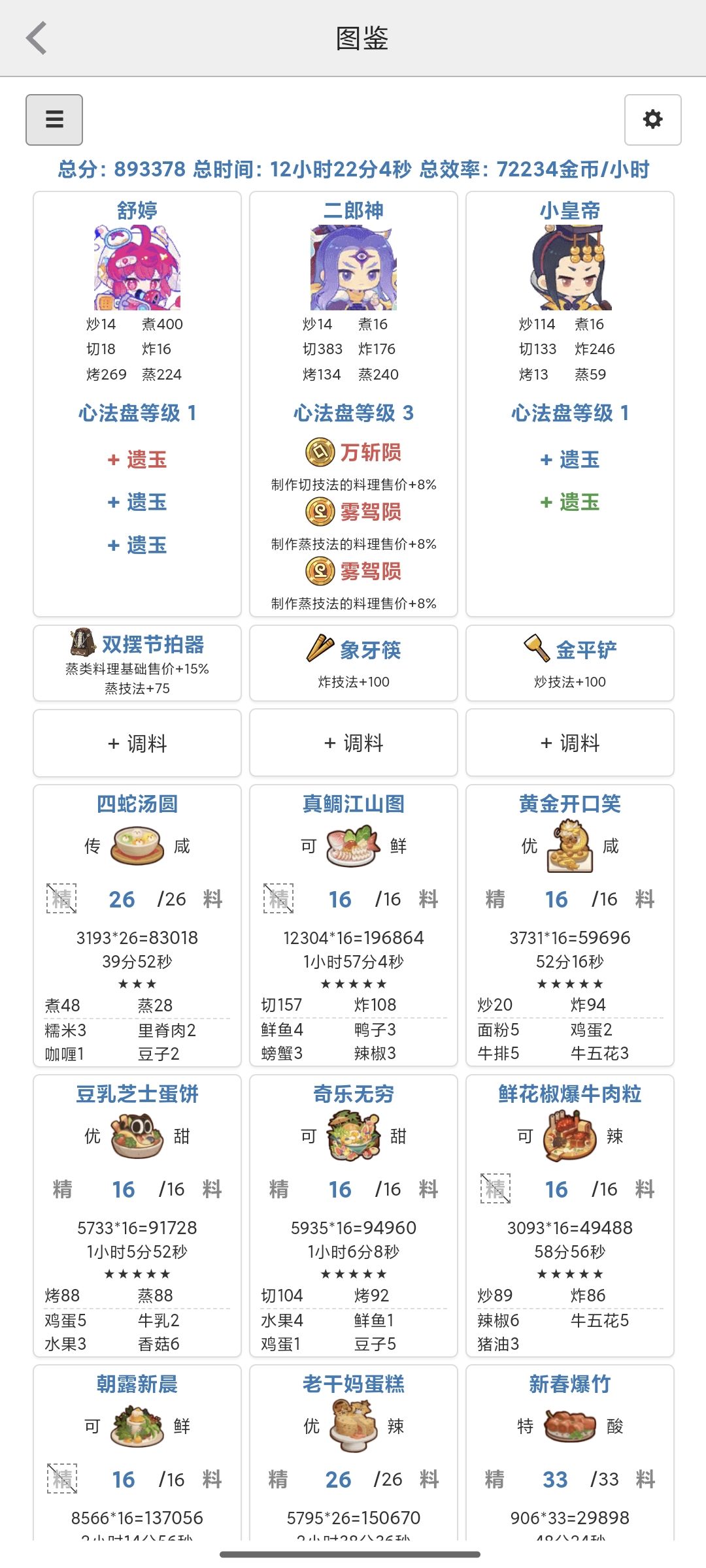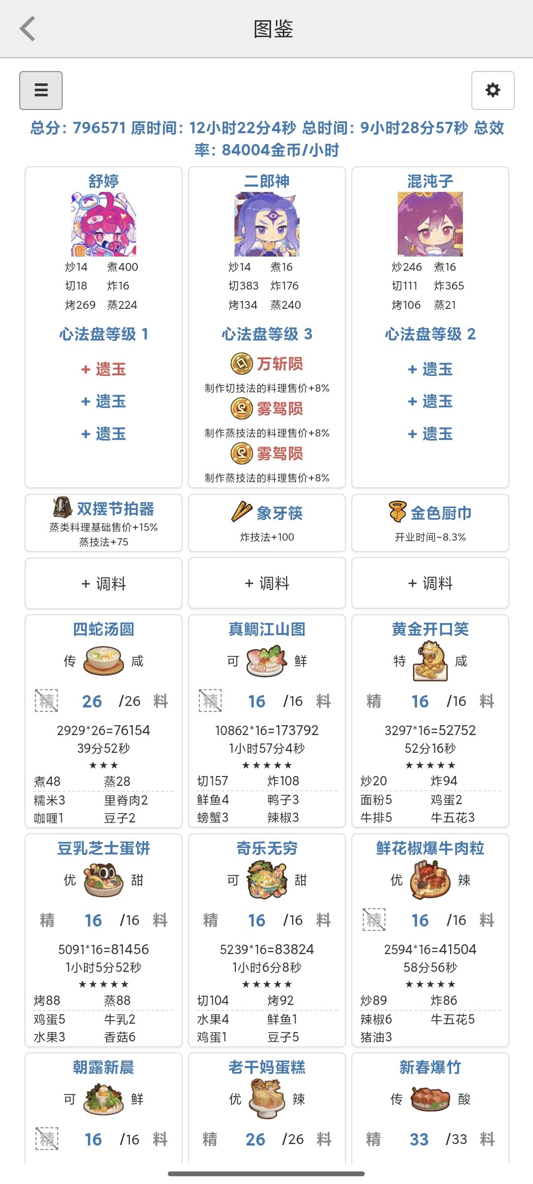 因此在计算刷金币方案时,先找菜,再找厨师。点击添加菜谱,自动按效率排序,看食材选择用哪个菜谱。(如果有特别强力的厨师,比如5火修炼厨,售价加成高的,可以先厨后菜试试)