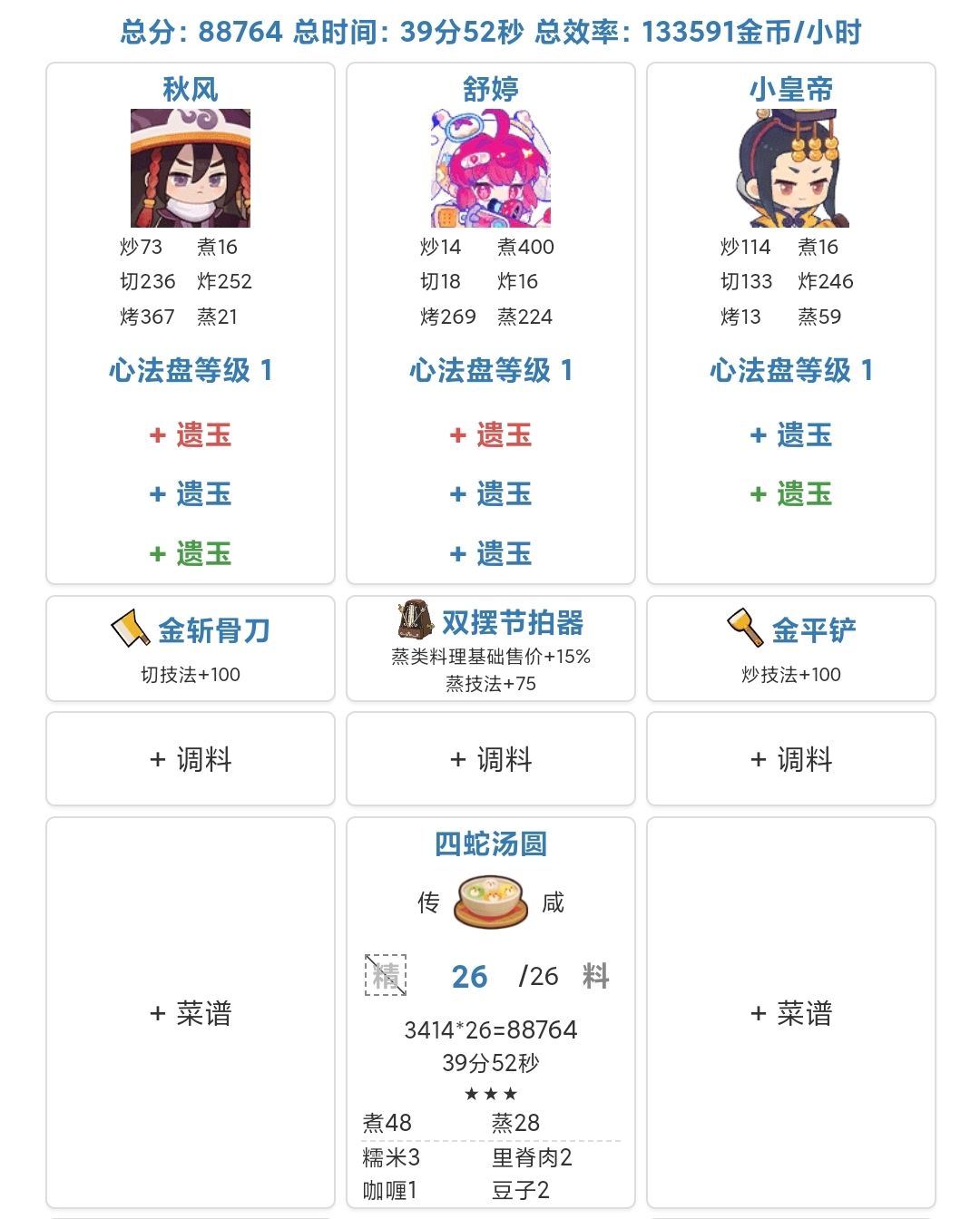 经过测试,宴会小团体并不适合萌新刷金币,原因有两点:1.宴会菜吃词条,可以用低🔥菜,但大多低🔥贵菜时间过长,不能用来刷金币;2.萌新菜谱不足,比如二郎神可以提供切类料理售价,但切技法且能刷金币菜数量少,黑风和小皇帝没有切技法菜可做,用不上二郎神buff,所以刷金币厨师自身实力影响更重要。(小皇帝光环不受技法限制,还可以用,但自身技法低,能做的菜不多,看个人情况选择。)