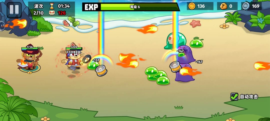其次是射手:狩猎小队和终结者。这个就不推荐用谁了吧,终结者是蓝色品质的,不一定每个人都能抽到。简单说一下两者的技能,狩猎小队在能量恢复之后接下来的数次攻击发射的弹幕数会增加,在局内升到4级之后,技能的覆盖率能到70%的,是个强度不错的技能。至于终结者恢复能量之后攻速提高,这个不是很好量化,他的攻击频率本来就是所有角色里最快的之一了,再加上技能的加成,射得飞起,而且后续升到4级,基本能保持攻速提高全程覆盖,也是一个不错的清怪技能。