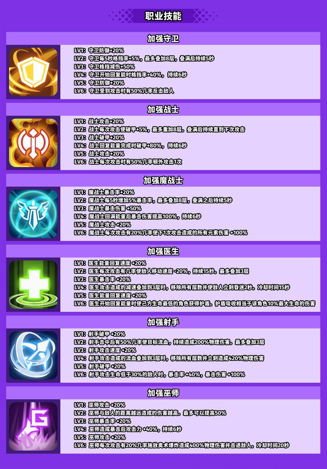 加强职业的选项,等级越高,他在对应职业的功能上越强,守卫是增强扛伤能力,医生是增加治疗能力,其他4个职业都是增强其输出能力。