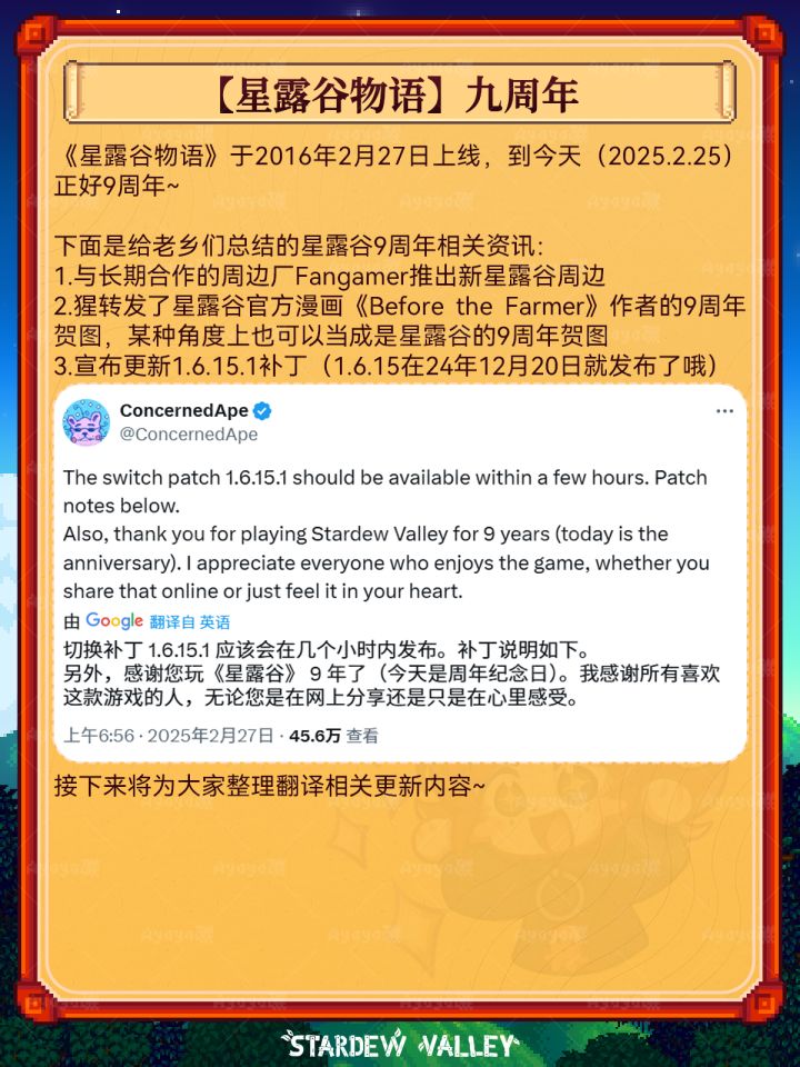 《星露谷物语》于2016年2月27日上线,到今天(2025.2.25)正好9周年~