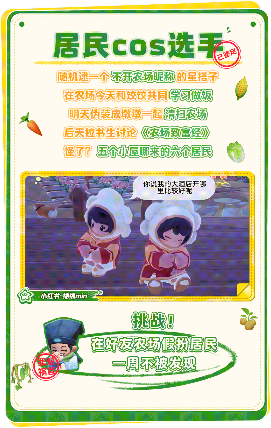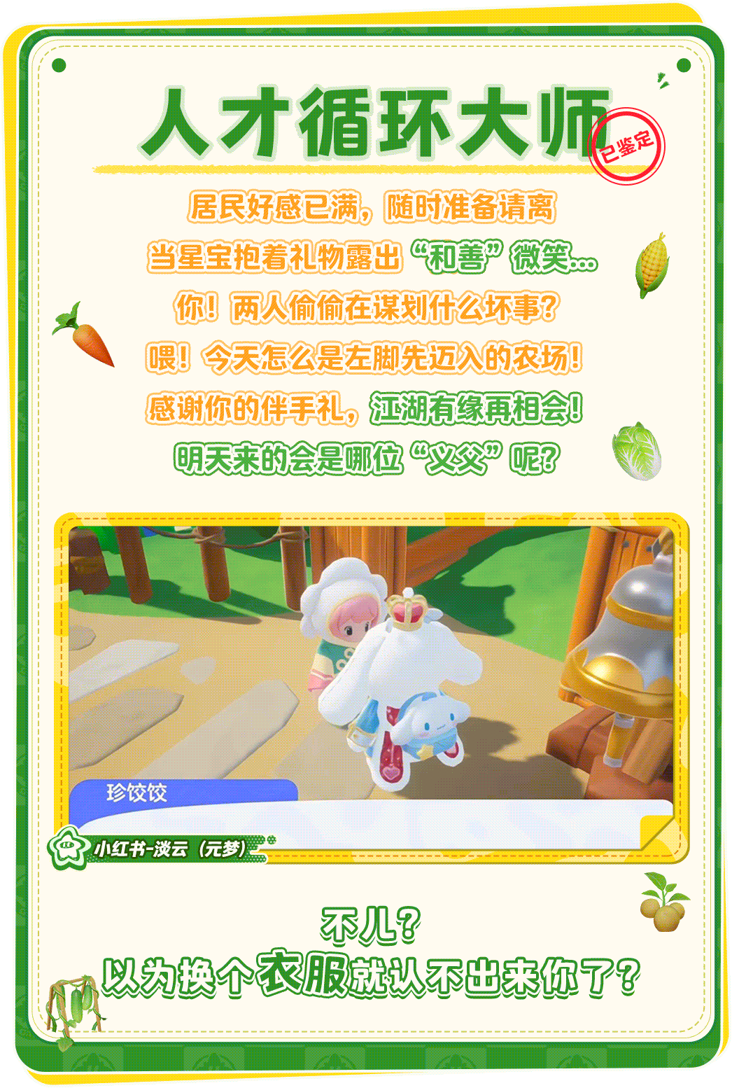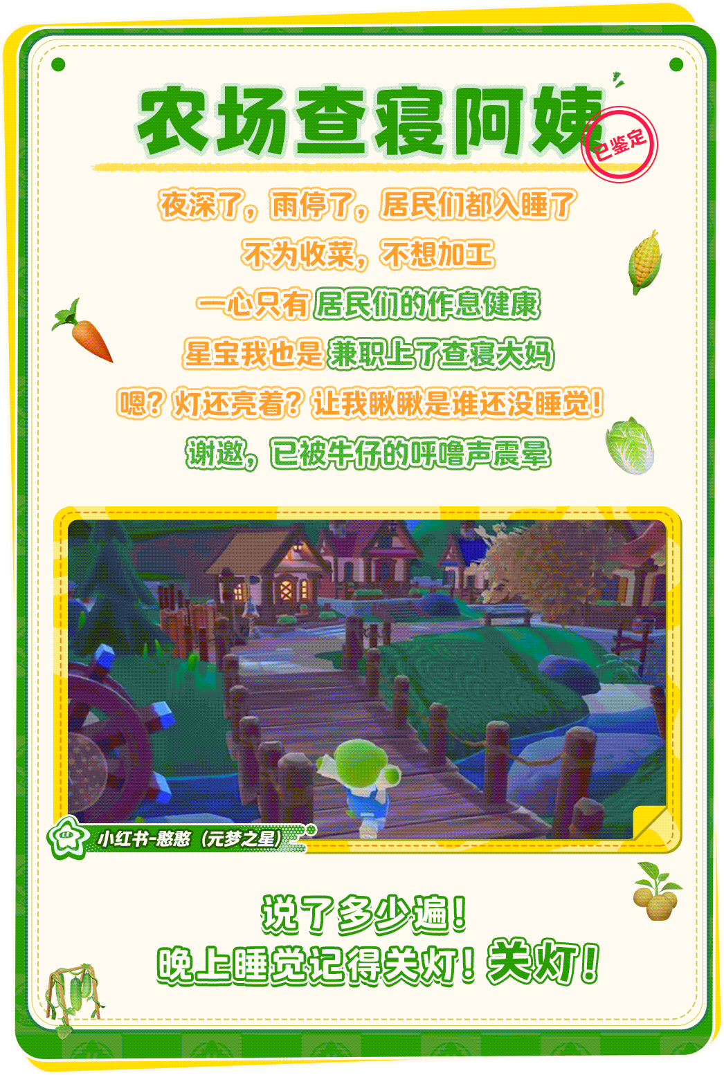 最近星妹夜观天象发现农场涌现一批"天赋型选手",他们白天Cos居民沉浸式过家家,半夜化身查寝阿姨搞突袭检查,社交签名一个比一个整活...星妹这就带星宝们鉴定一下这波网络热门星宝行为
