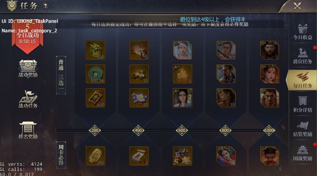 2、每日达到指定战功后,可以三选一选择一项奖励