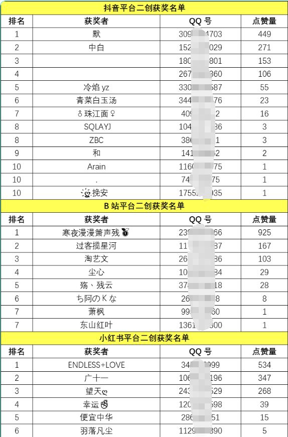 感谢大家对二创活动积极踊跃的投稿,根据活动规则,剔除了无效链接,经过数据统计及除重后,获奖名单如下: