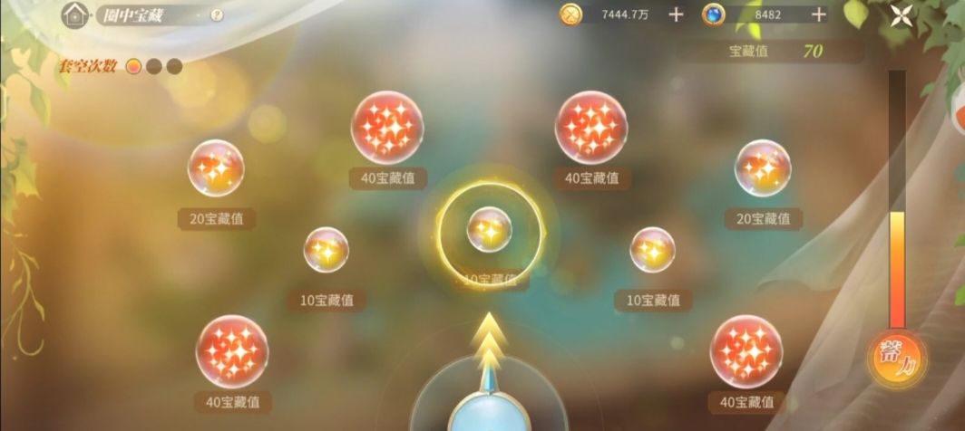 没改之前,我选择的是套10分,20分太远,40分没容错,只能选择10分,套的技巧是当箭头指向宝和藏中间的时候,蓄力值一半左右时候释放,这个蓄力值的感觉就是你的手要摁一会儿,不能放上去还没感觉就松了。箭头指向宝藏中间时容错最大,偏一些容错就小了,但这个不难。