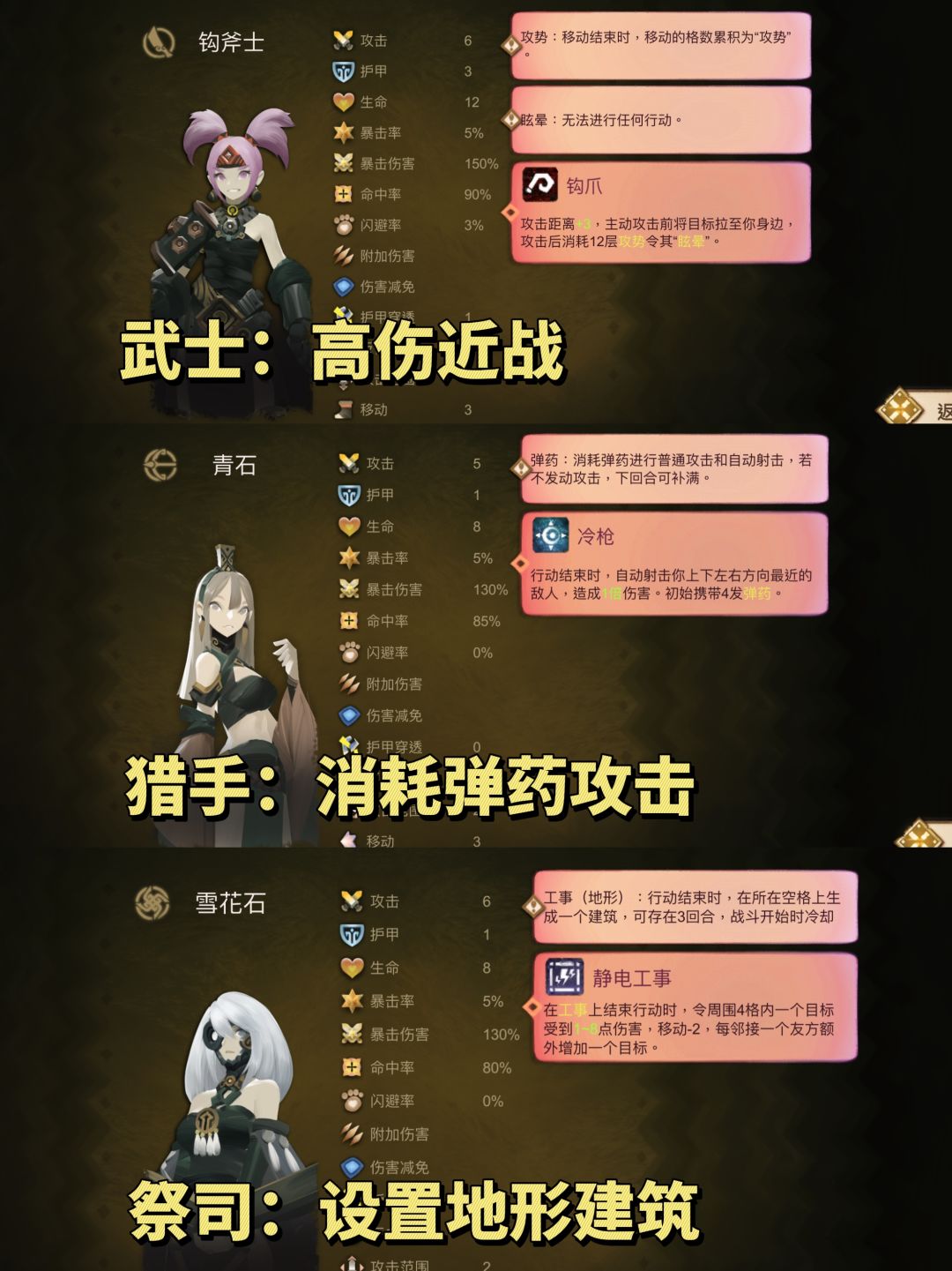 甲卫:坦克,以抗伤害为主,也能给队友提供buff或者对敌人造成少量伤害。
