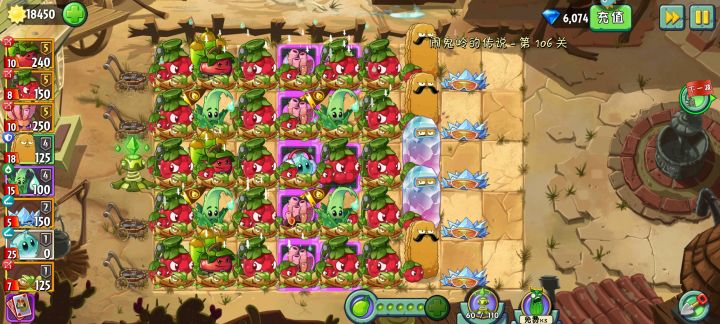 现在是如图这样的放置,为了对付鸡群,删了一个击退的泡泡姬,放了一个冰冻生菜,一旦坚果摇了,就给生菜豆,全屏冰冻就没事。但是不稳,有时候手慢了,就会要重开。豆子倒是不缺,桑葚有紫手套。