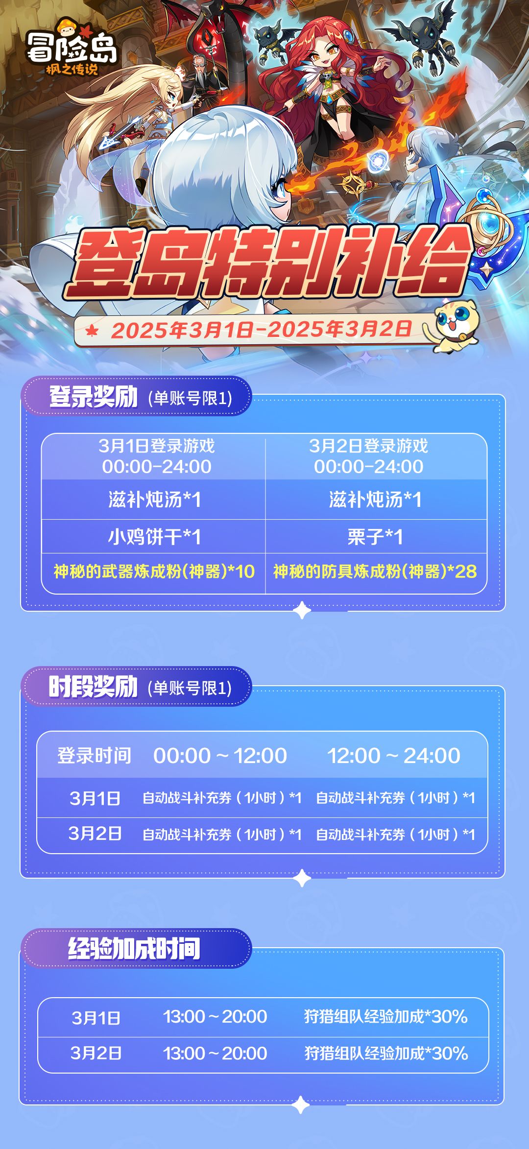 3月2日 00:00~24:00 登录游戏:滋补炖汤*1、栗子*1 、神秘的防具炼成粉(神器)*28
