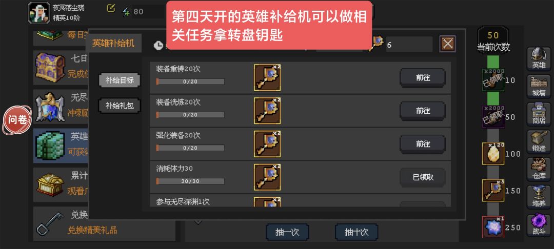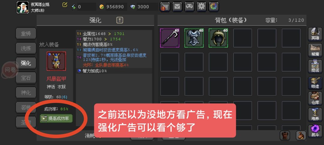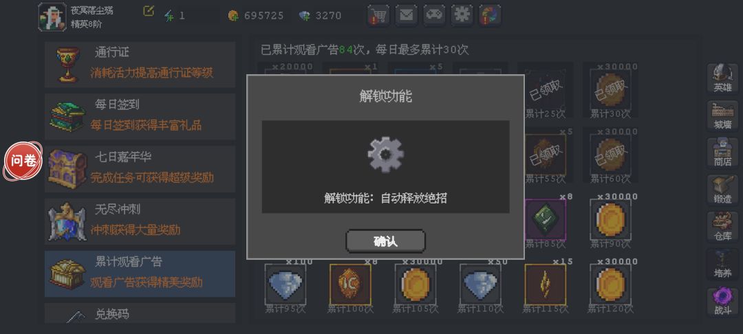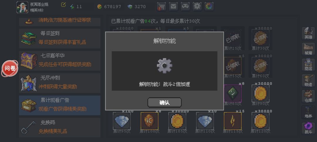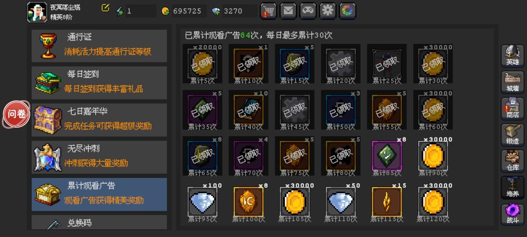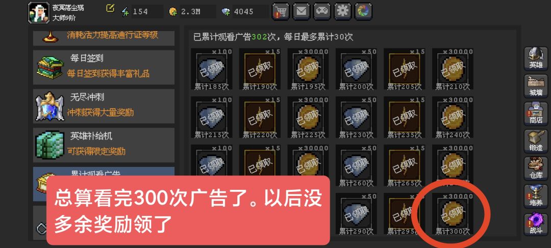 开局务必看完每日30次广告(开背包和仓库,因为装备容易满)没时间就趁吃饭休息时间点广告刷满30次!广告还挺人性化的,不是全60秒,有16秒,30秒还有6秒的!