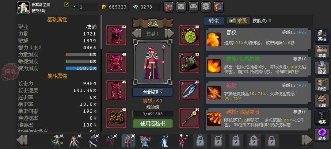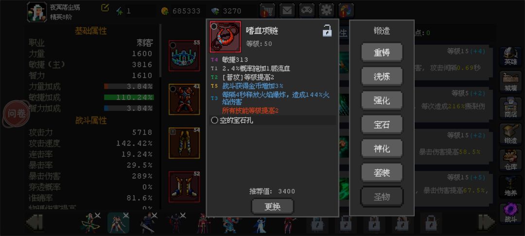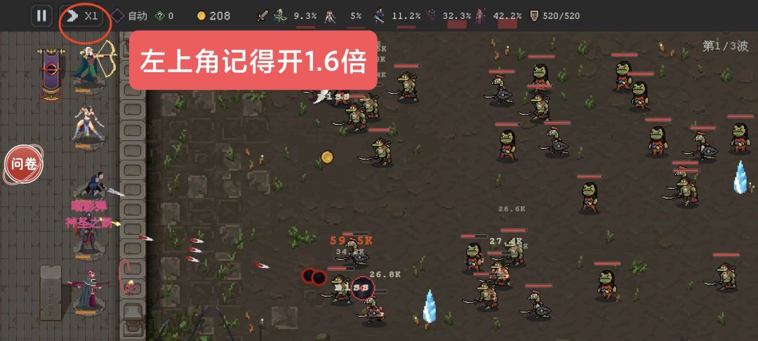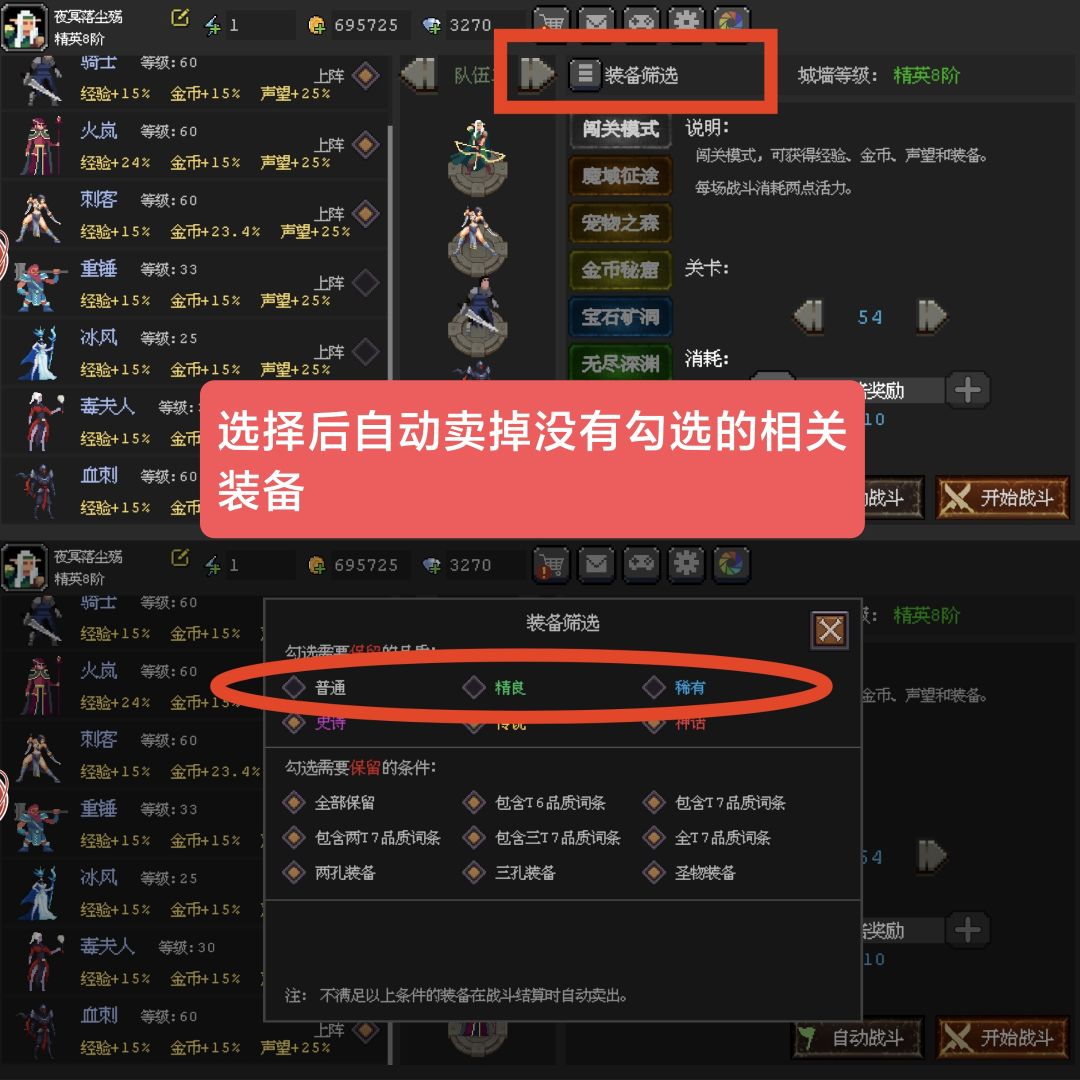 开局应该会卡第七关和第十关。记得回退一关开双倍刷装备和经验。关卡进度达到50后可以挂机更高倍率了,不然太浪费时间了。