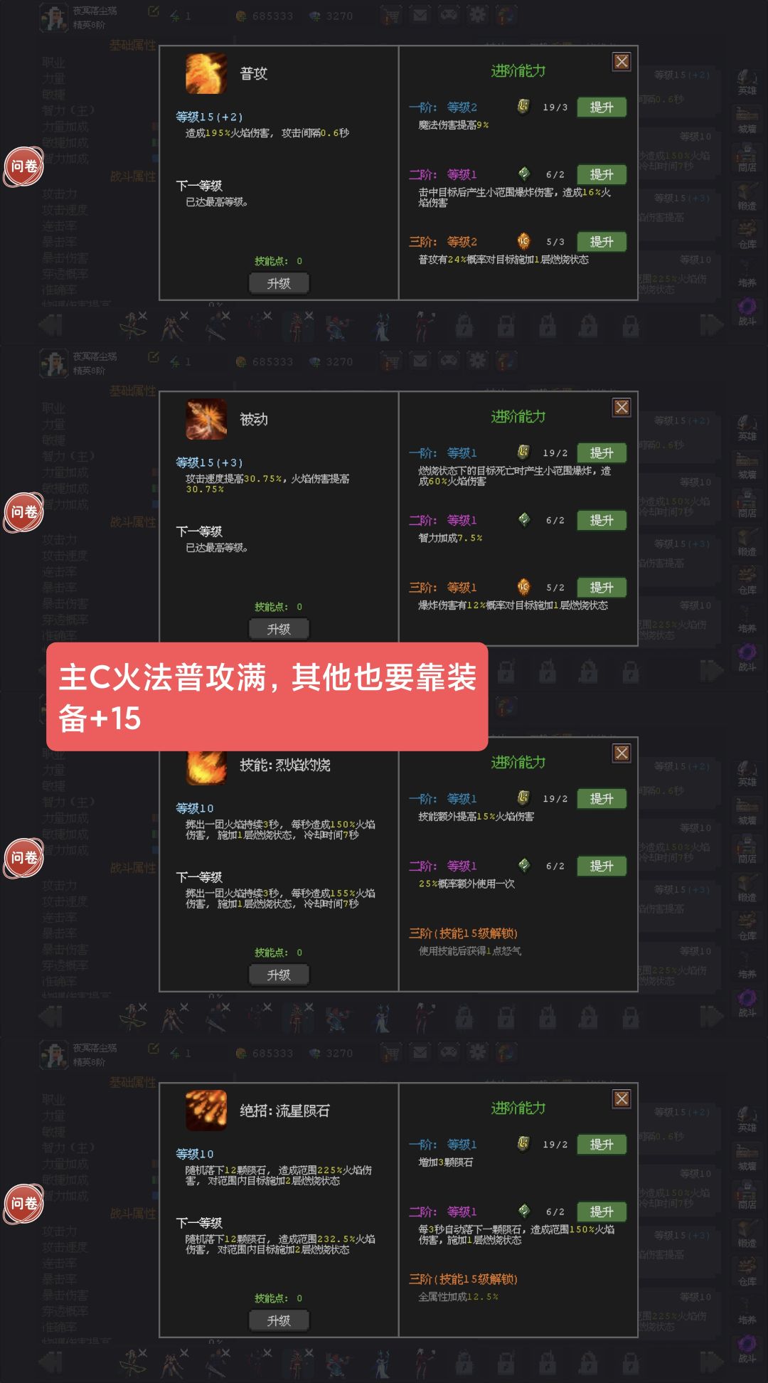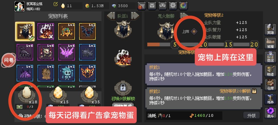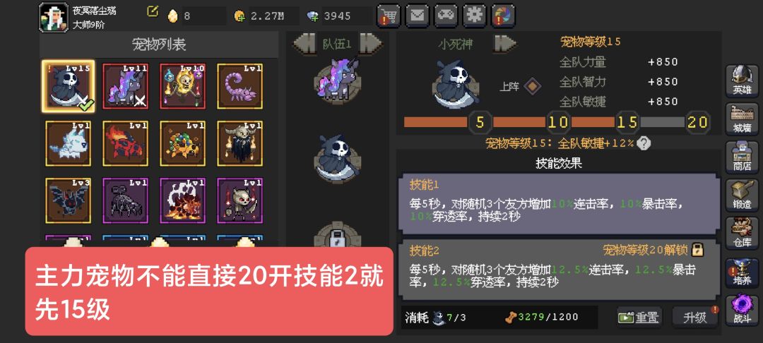 主力上阵宠物不能达到20开技能2就先15级全队三属性都开留给其他升级!另一个不能达到15级就停在10级就行…