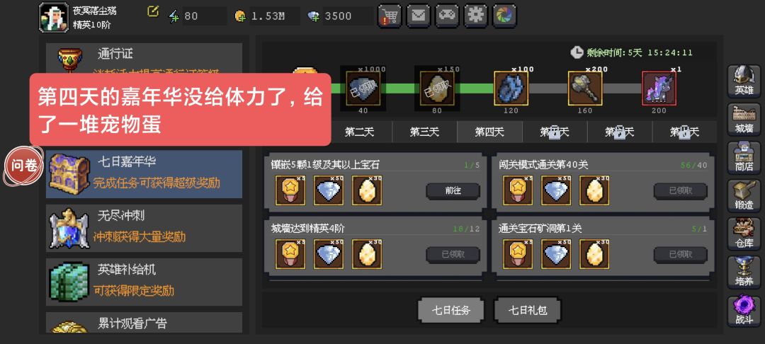 前两天钻石不多可以悠着点不用钻石买体力。等第三天基本角色都满60了又差不多一身红装再来看进度钻石买体力。