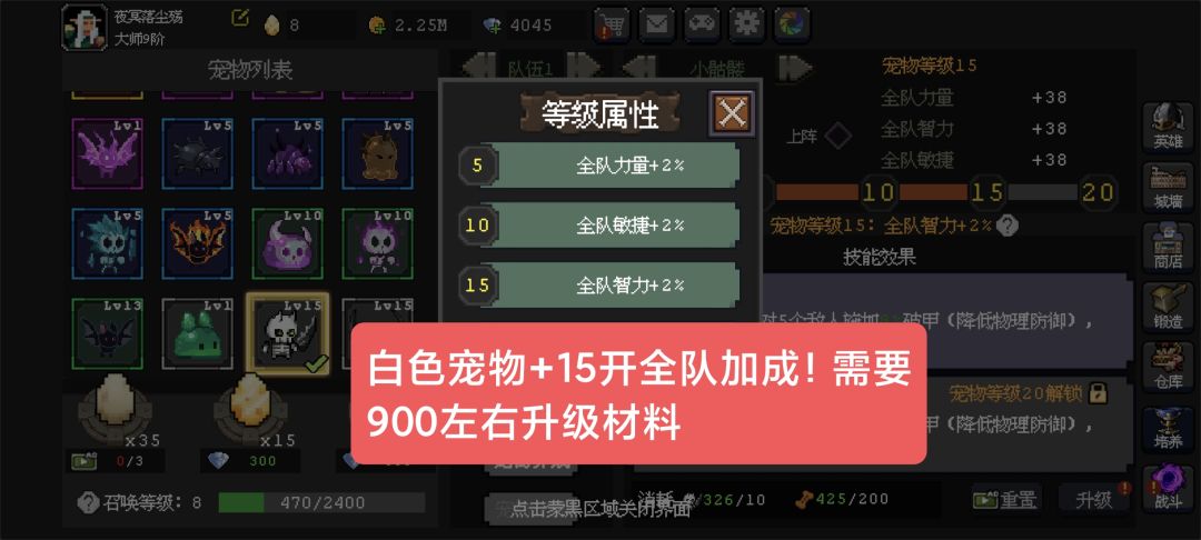 宠物经验不多就把白色拉15级!材料900左右看看自己剩余资源搭配,不行就重置重新升级!