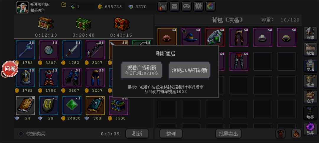 游戏过程中发现背包很容易满,需要时不时的清理背包。这会我们可以通过看广告开背包,也可以利用装备筛选把不要装备直接结算卖掉!
