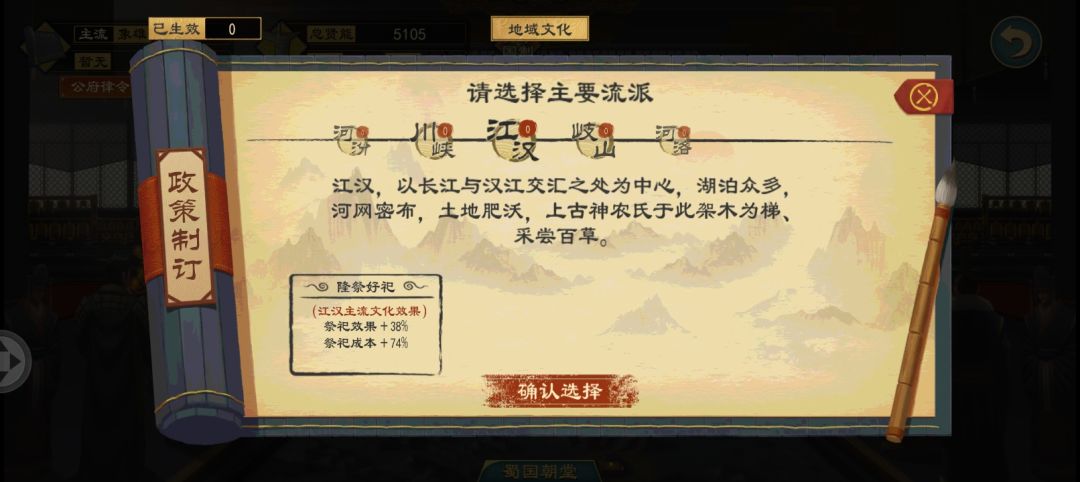 5.虽然流派政策没法在流派界面显示,但还是可以靠自动施政的功能点政策。具体操作如下:通过战争俘虏,策反等方式(不太推荐用粮草直接招人,除非是辰韩,象雄和扶余这三个文化。即使要招也建议在民间主流文化变成对应文化后再招人)获得一个有你想点的政策的人才(人才的流派必须与该政策,以及你的主流流派相一致),然后把他放到朝堂上,之后点击自动施政并sl到你要点的政策。