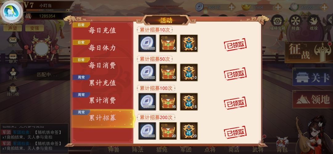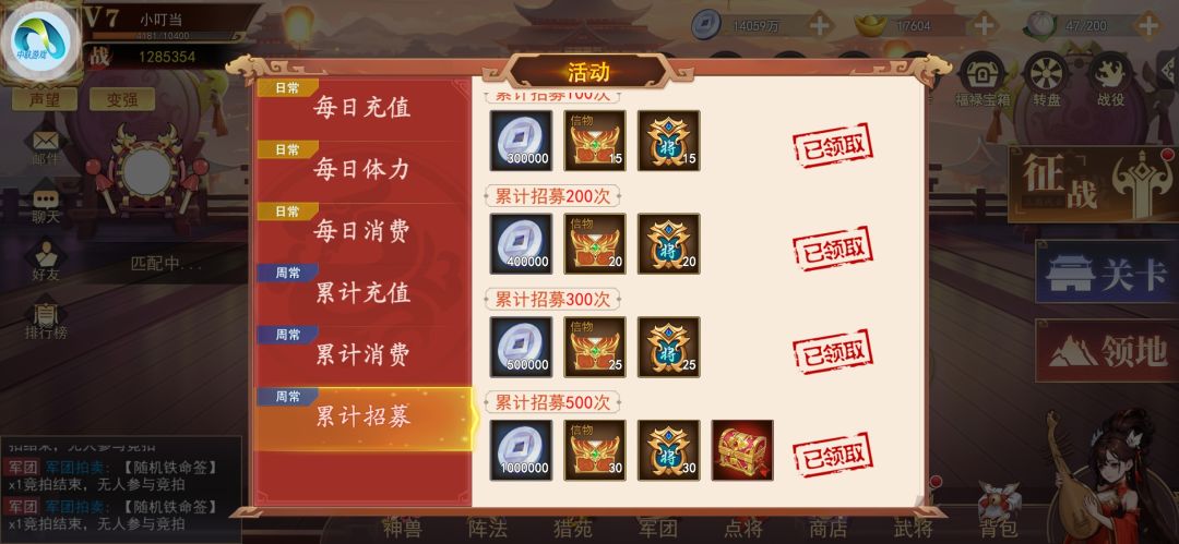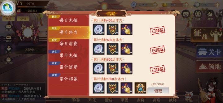 在前三天有开服的战力榜单和等级榜单,闯关后最好抽奖拿武将继续闯关得抽奖令,三天结束也就是限时榜单结束后,建议在4—7天时攒着抽奖令,因为在七天后有了抽奖活动和每日体力活动,奖励也是比较好的,非常建议每周能把奖励拿满。