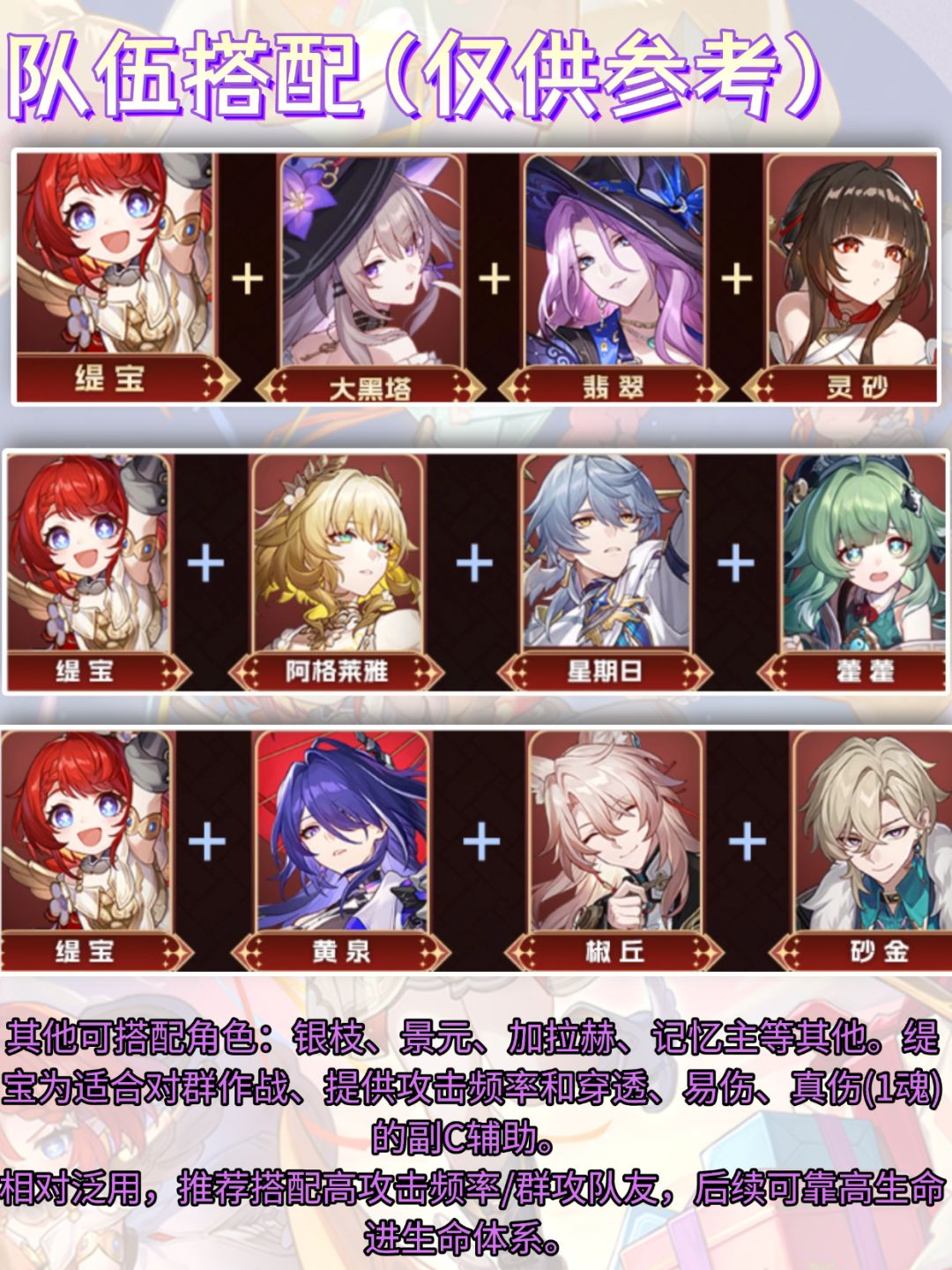 ①通用辅助,稀有的抗性穿透增益与易伤增益,队伍提升大。②又肉又输出,缇宝的伤害是生命倍率,堆生命值即能保证缇宝的生存能力,又能提高队伍的伤害。