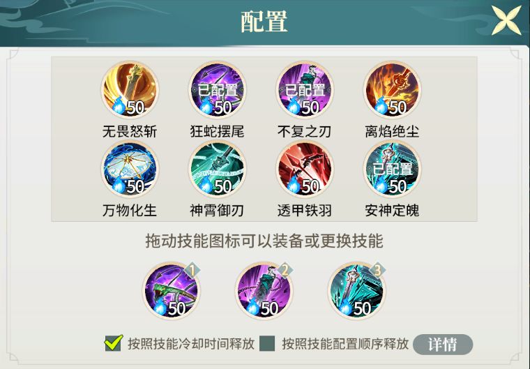 按照技能冷却时间释放:优先释放已冷却的技能,同时冷却完成时按照配置顺序释放