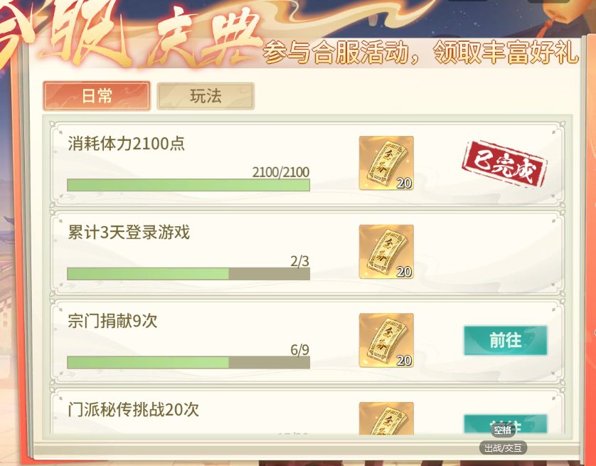 合区活动包括日常和玩法两大类,奖励都是金券,完成难度不高,具体如下: