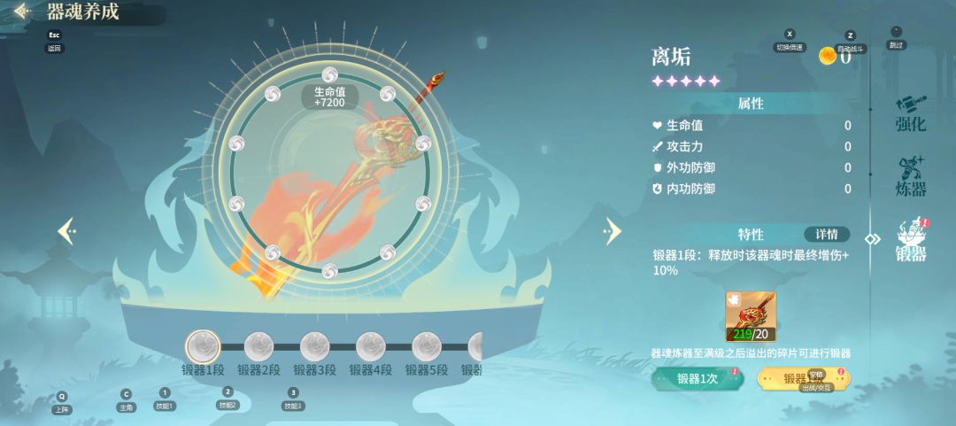 - 锻器1段:释放该器魂时最终增伤+10%【每级20碎片,升段需要200碎片】