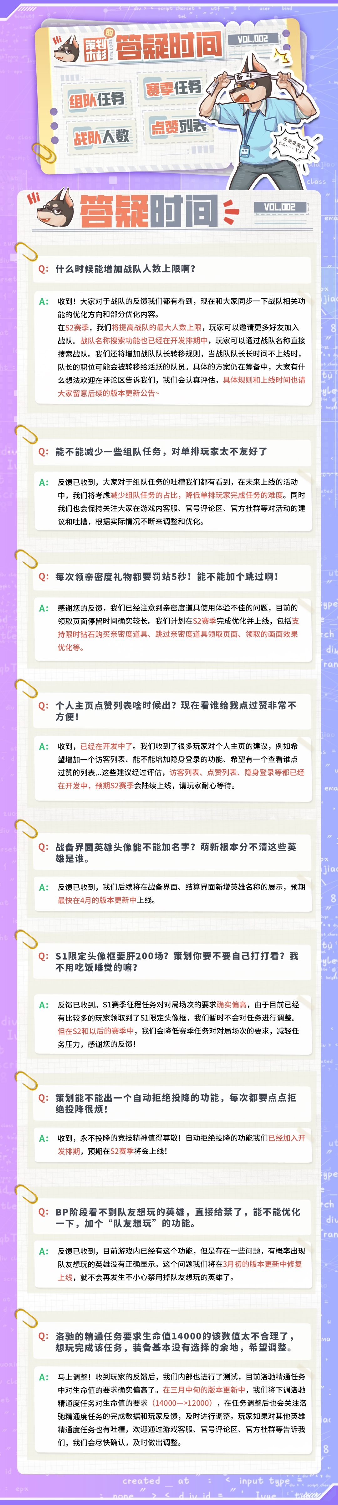 又到周五啦!战斗策划木杉加班时间(×)答疑时间(√)又到噜!本期策划木杉针对组队任务、战队人数、赛季任务、点赞列表等近期友友们关心的问题进行了解答,快和娜娜一起来看看吧~