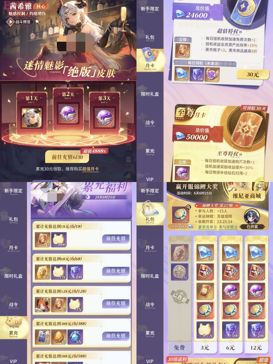 总的来说就是这么多,虽然不是很全面,但这样可以卡满每个氪金档位,让我们在游戏之中不会造成浪费。