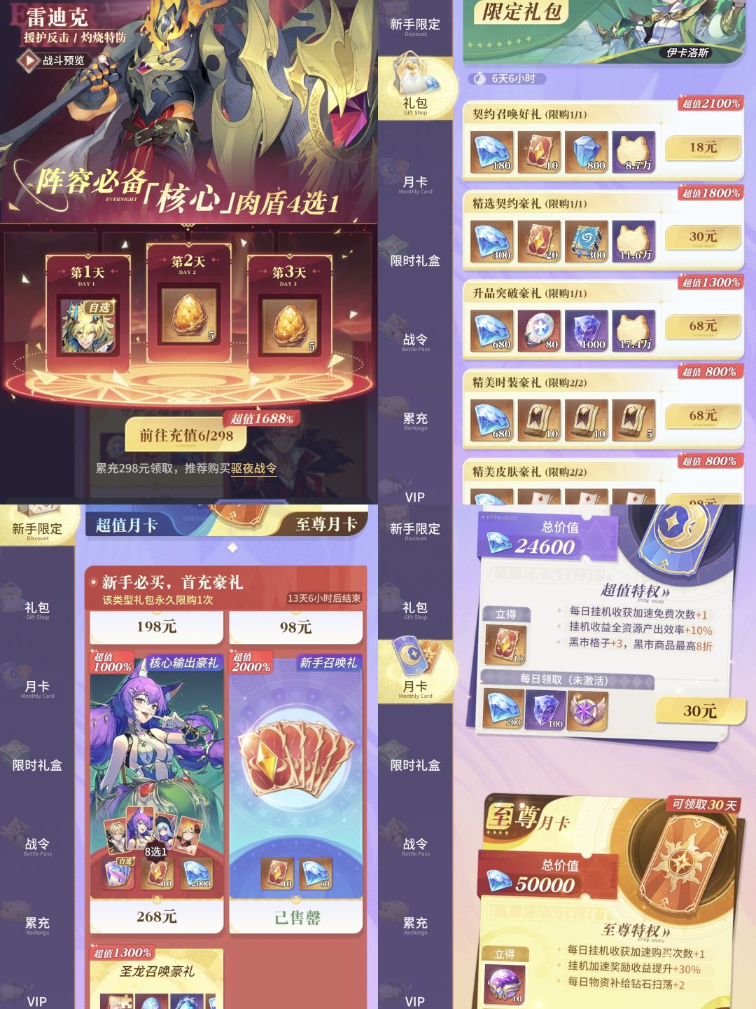 我们可以我们可以购买至尊月卡,核心输出好礼以及,契约召唤好礼,这样我们可以获得较多的抽卡次数,并且可以获得一位传说核心自选,帮助我们快速提高战力,并且这样充值可以卡298元档位获得,核心肉盾自选四选一,为我们的阵容增添一位前排。
