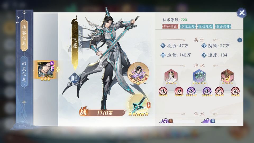 2号位子雷飞蓬,本战唯一输出,神祝运力,体体/道道,法术,神祝最好5星,魂器满星选择双增伤,专属1星,S3套