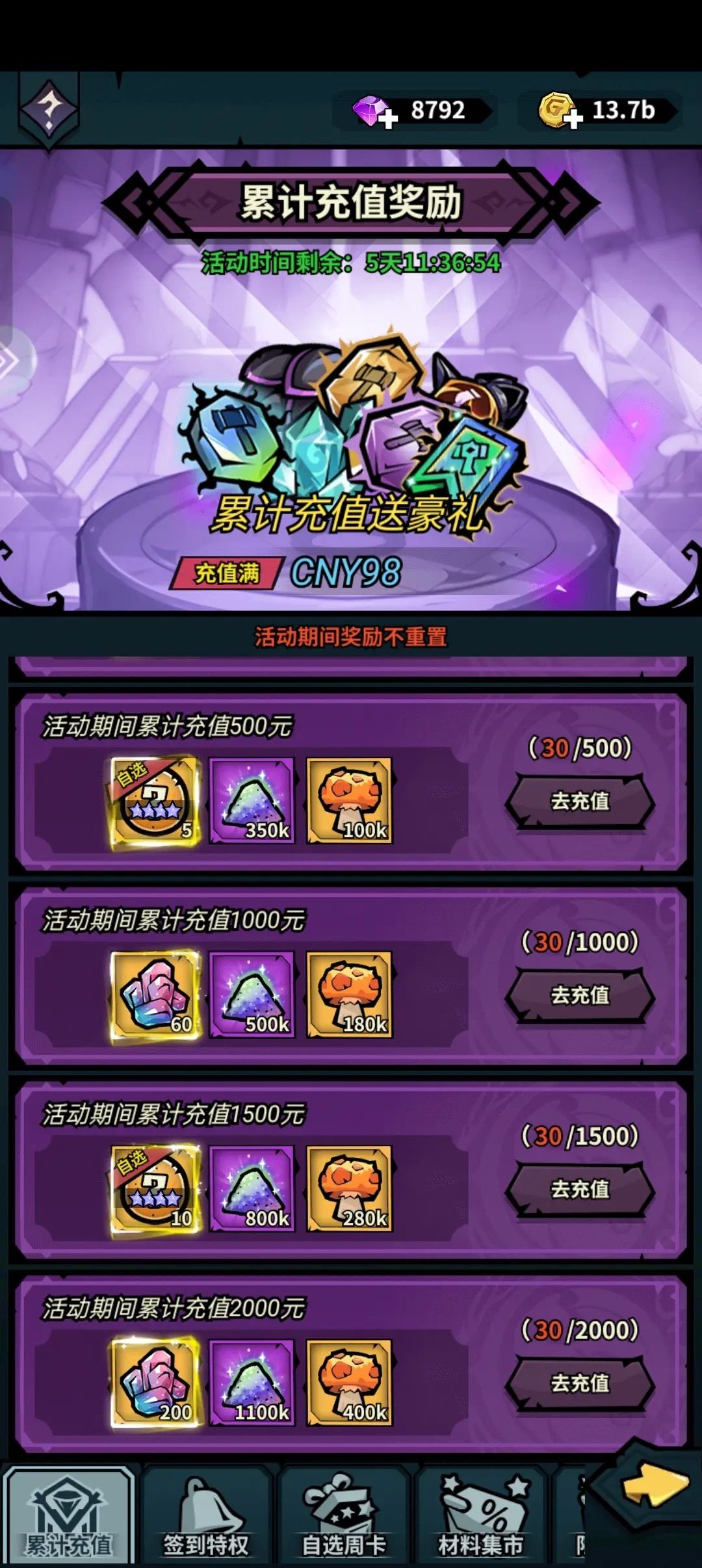 合区第三周大概会有消费返利(前面大佬和我说的)应该是有个有消费5万钻石的活动,送一些强化材料这些,还是非常合算的,这时候可以借助平时攒的钻石和英雄卷一次性把鲨鱼拉满星,白嫖这些奖励。