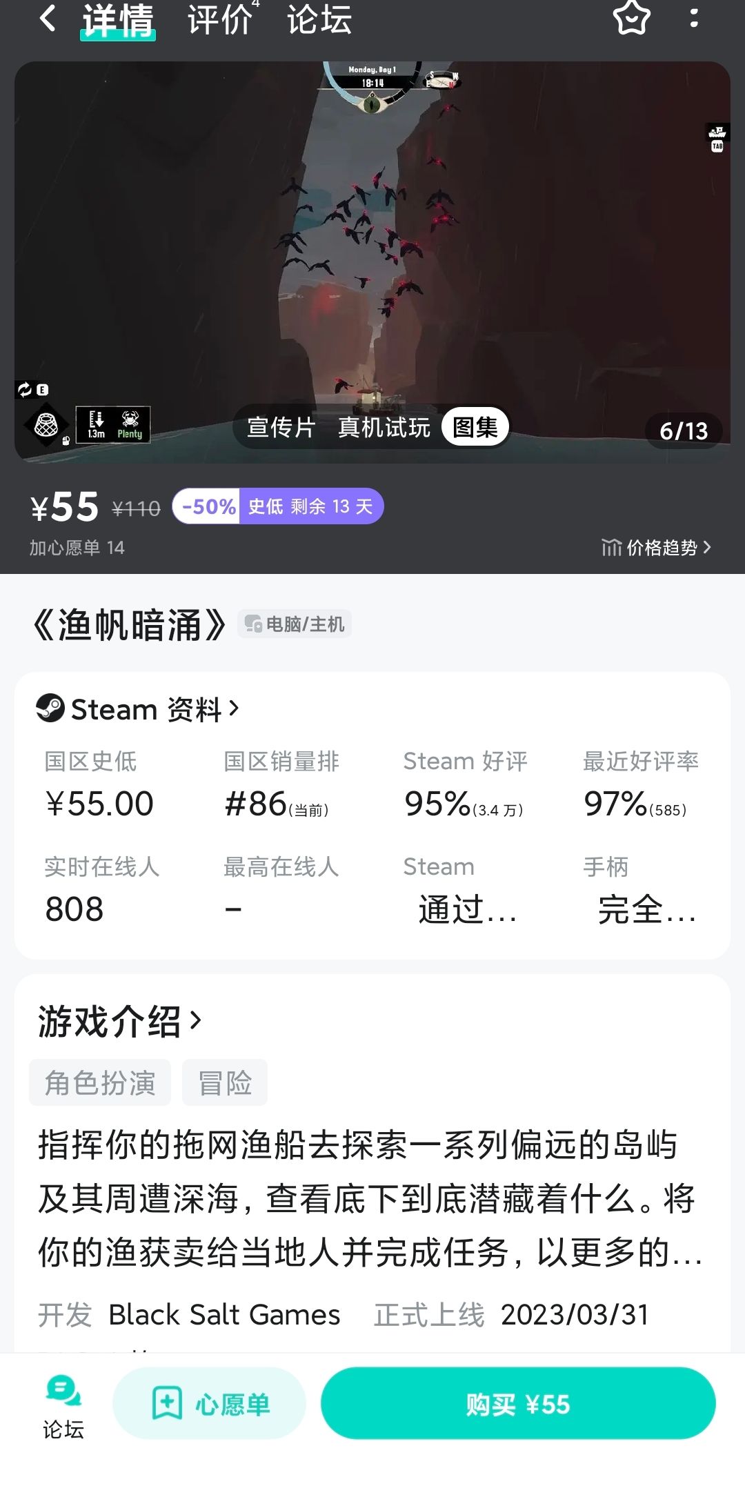 这是一款由 Black Salt Games于2023年3月31日在PC平台发售的一款单人钓鱼冒险游戏。