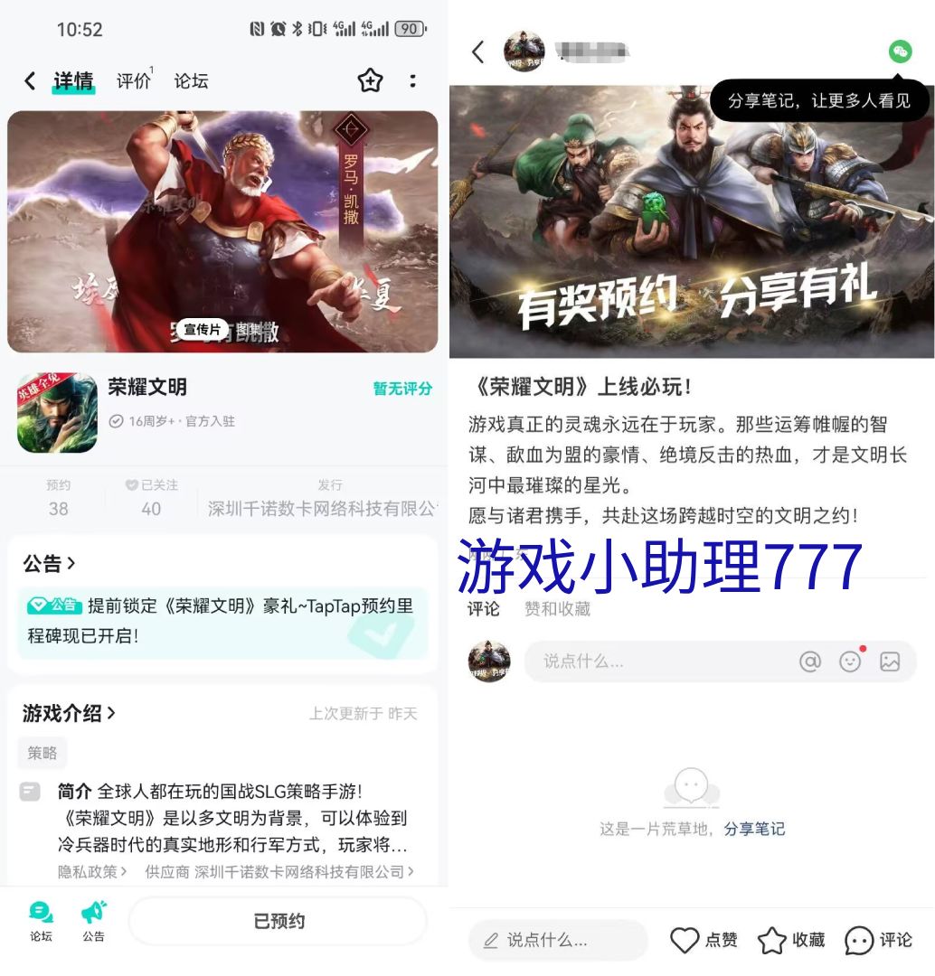在《荣耀文明》社区主页点击【预约】和【关注】并截图然后将《荣耀文明》TapTap主页或本活动页面/本帖的活动图 分享在 朋友圈/微博/小红书 任意一个平台,且不可屏蔽任何人哟~