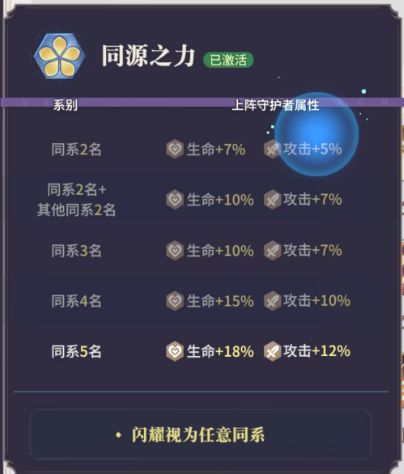 上阵灼烧队,可获得同源之力——上阵同系5名,生命+18%,攻击+12%;还可获得“操焰者”效果——3位操焰者上线,“灼烧”效果伤害提高30%,带有灼烧效果的敌人受到治疗效果降低15%。