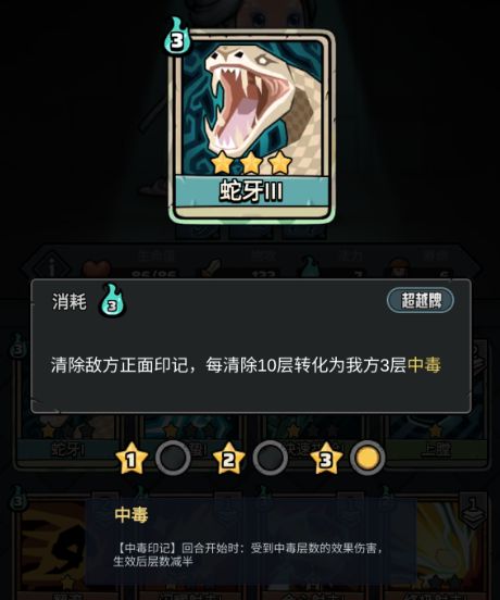 种族专属卡牌:”蛇牙“,目前代号肉鸽中效果唯一的牌(清除目标正面印记),个人感觉还有很大的开发价值。但目前的正面印记来看,没有什么非要花3费清除的。现在游戏中常见且比较头疼的正面印记有嘲讽、亡灵、怒火、专注、再生、荆棘。嘲讽状态下”蛇牙“用不了,怒火、专注、再生这几个能一回合秒的话基本都不需要清除。亡灵特殊点,但游戏里电击和吸血伤害可以无视亡灵。只有角斗场打猫榴莲可能需要清除荆棘印记,需要清这个印记的都是物理职业,主流的”盾击“牌组精简,加入这张牌会污染牌组,陷阱猎人不怕牌组臃肿,但就怕没抽到这牌自己就噶了,可能只有玩”幽灵剑“的能带着用用。综合来看还挺鸡肋。不知道其他大神有没有好的用法?