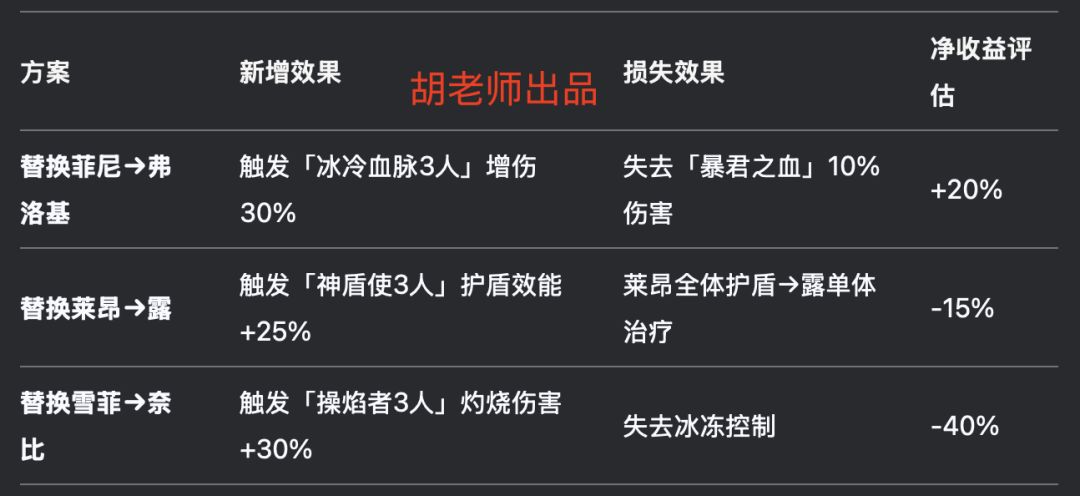因最初组合效果割裂导致强度未达上限,通过弗洛基替换菲尼,实现: