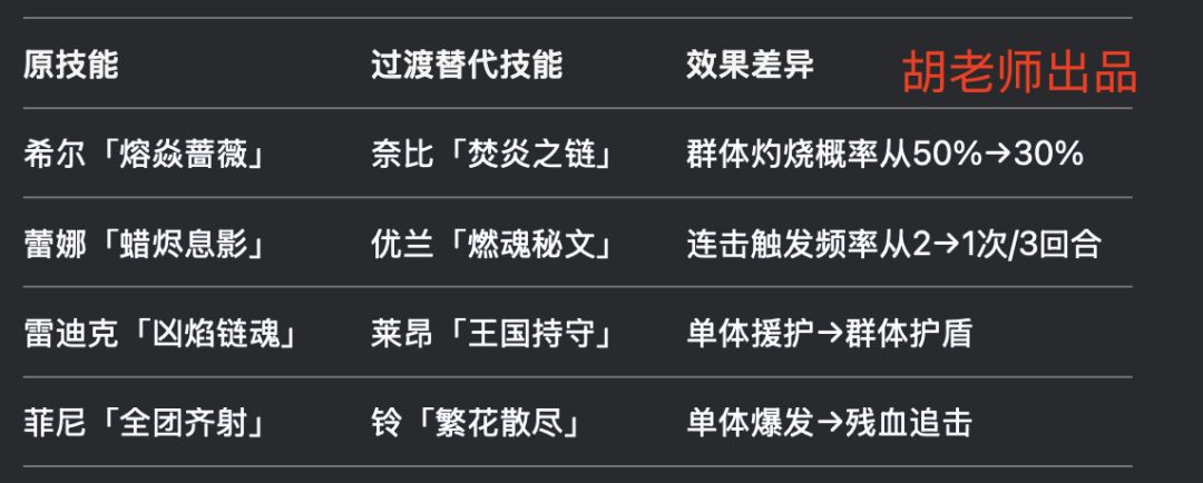 雷迪克(援护)替换过渡冰火 莱昂(护盾)援护→全体护盾,更适应AOE环境