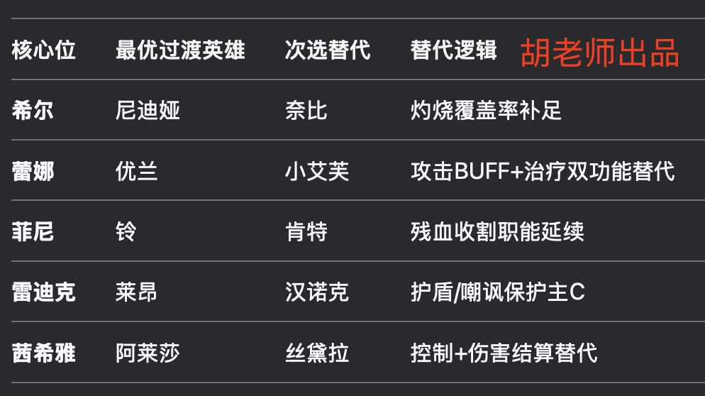 如果你没有这个理解,你是玩不明白冰火的,因为有对位控制要调整,记得点赞和收藏支持一下,我的攻略尽量用大家都能容易理解的术语,避免过于技术化,同时保持专业性和准确性,还有针对0氪平民给出以防某个英雄未获得。并列出每个核心成员的替代英雄,并评估强度,确保替补后的队伍依然有效。