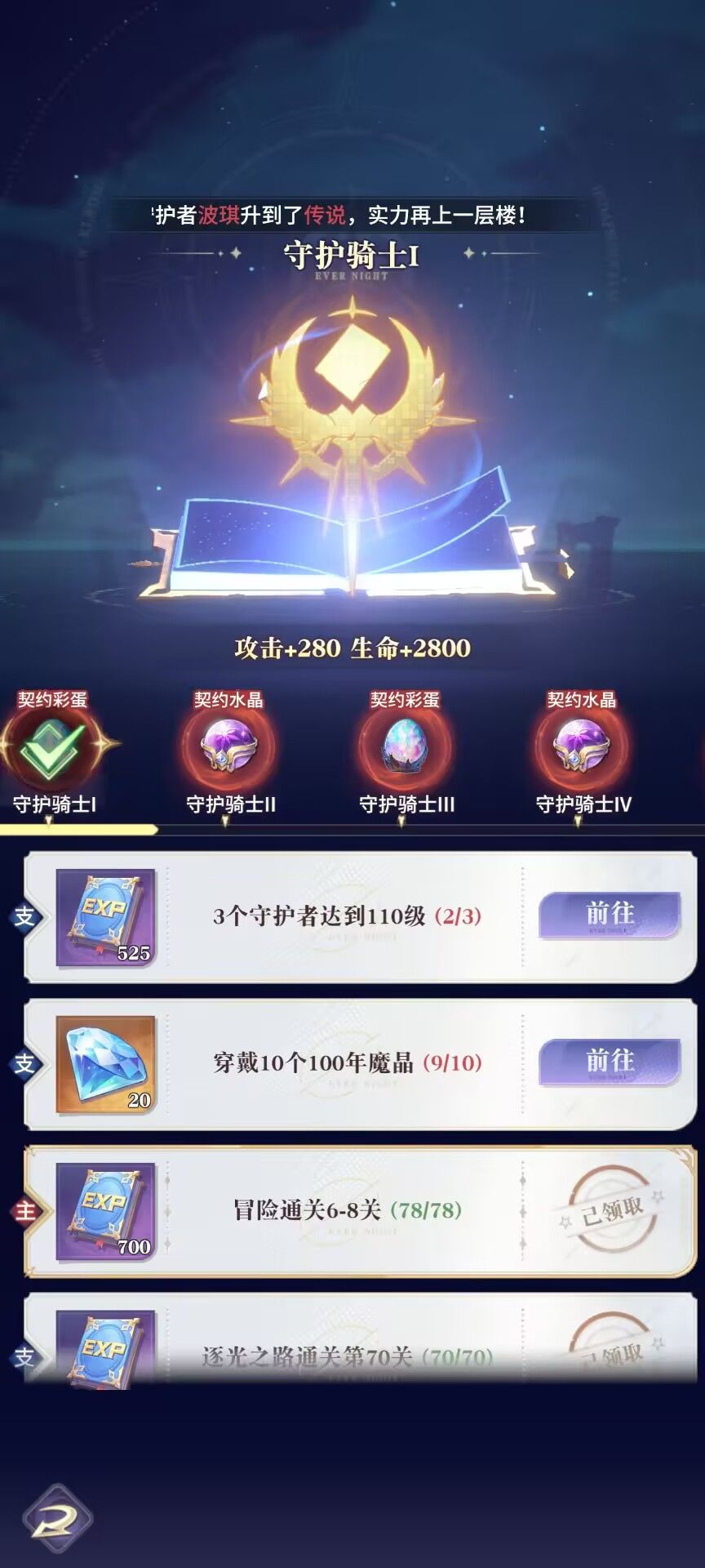 ④主界面右下角的骑士任务,大家一定一定按照任务进行游玩,这里被卡的话会浪费非常多的资源,就比如我图中的穿戴10个100年魔晶,这里魔晶装备前期是比较有限的,千万不要分解,全穿上来达到10个。