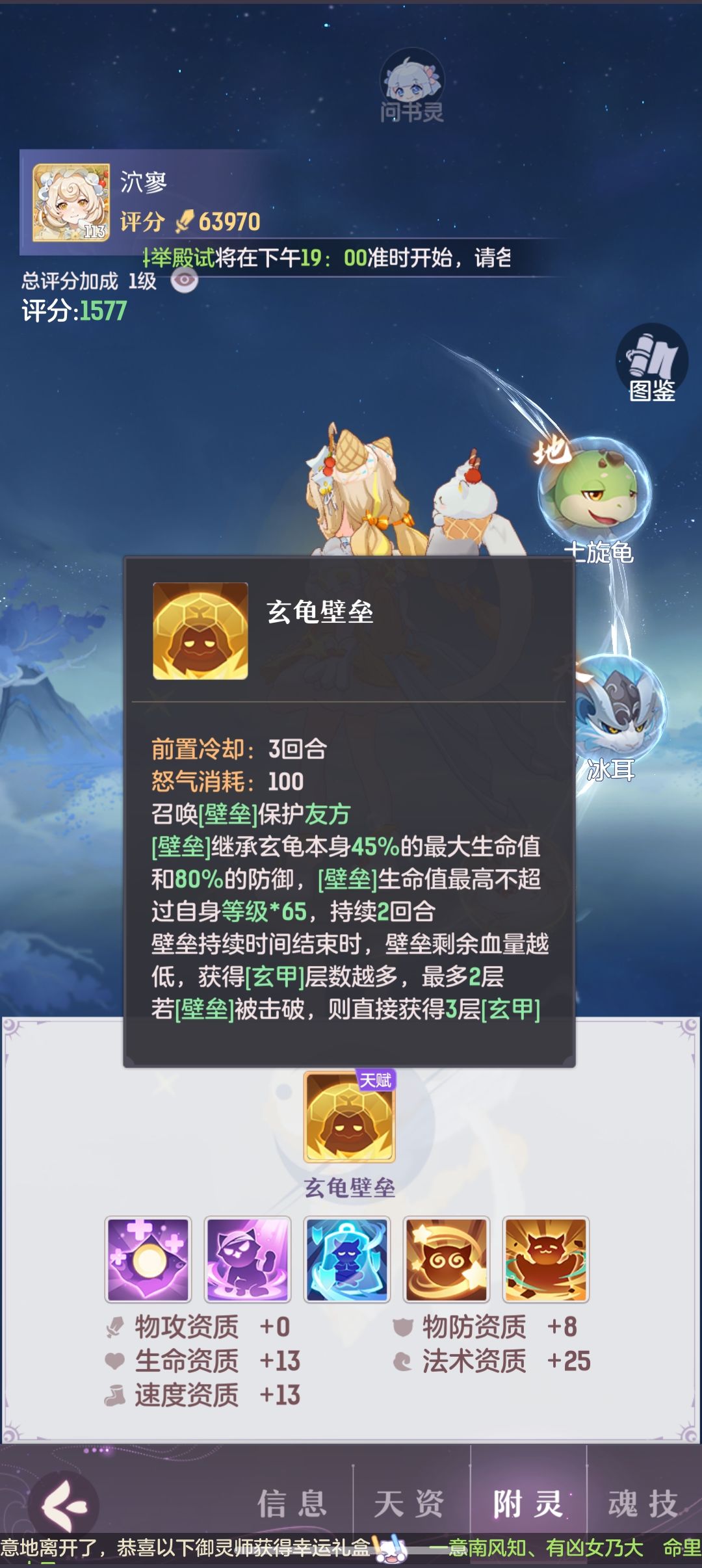 3、卡89的辅助小伙伴,首发首选配速晨星,附灵龟龟的墙,个人觉得辅助宠功能性的附灵技能最好的,一速配速的墙放的好可以挡很多技能,比如混天绫的禁魂、青丘九玄的封印