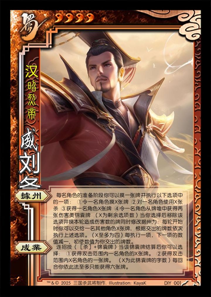 个人认为桃园三兄弟中二弟有了武关羽,三弟有了神张飞,只有大哥没有一个特别强的形态,于是自制了一个威刘备。