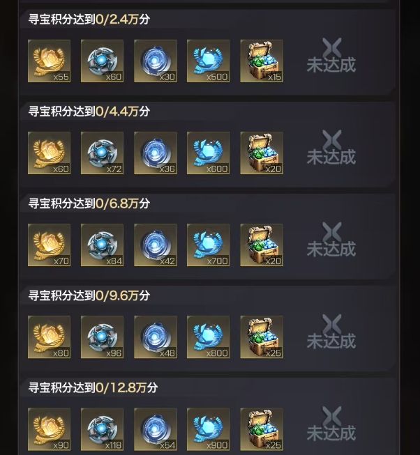 获得宝箱奖励时额外获得寻宝积分,积分累积到一定进度可额外获得奖励,包括泰能辉金、能量聚集器、能量吸收器、泰矿母体等道具。