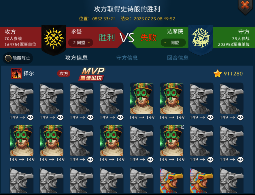 |在致远晓峰及锋芒大千、泽尔绝对领先的指挥战术引领下,不论是的友盟,还是不畏强权的散人,同时给予我们帮助和支持,我们减少了屡屡因兵力不足而失败的问题,逐渐拥有了反击甚至打赢塞灰城战这一地狱难度的实力(游戏给守方提供的保护机制),我们屡战屡胜并且不断加大战损。我于2024年末发出了联盟正义的呐喊。