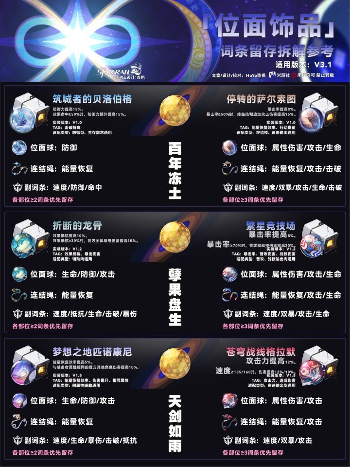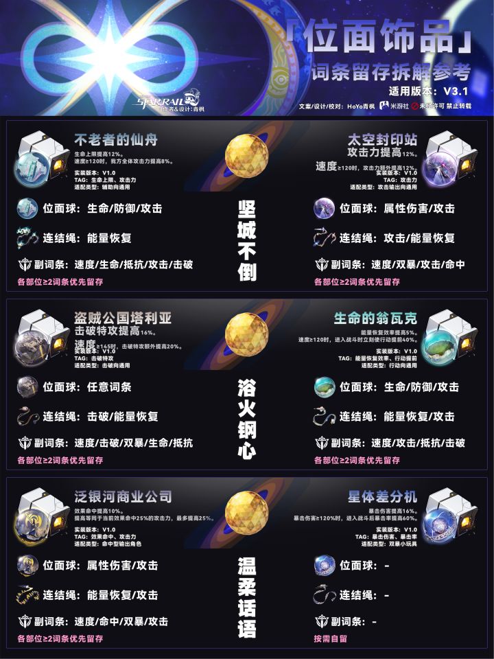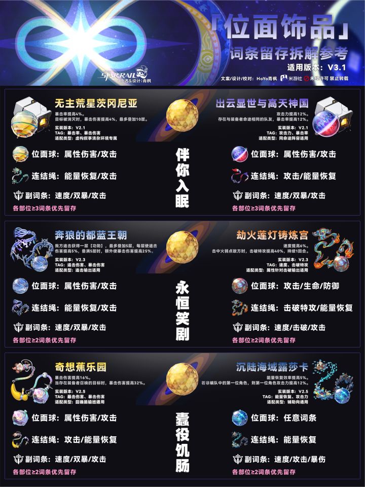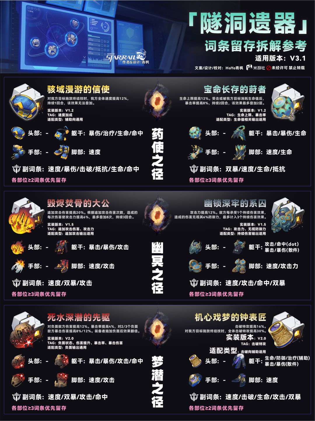 以下为个人见解,为大家整理一份当期版本的遗器词条留存推荐表,不满足条件的无情拆拆拆就完事儿了~