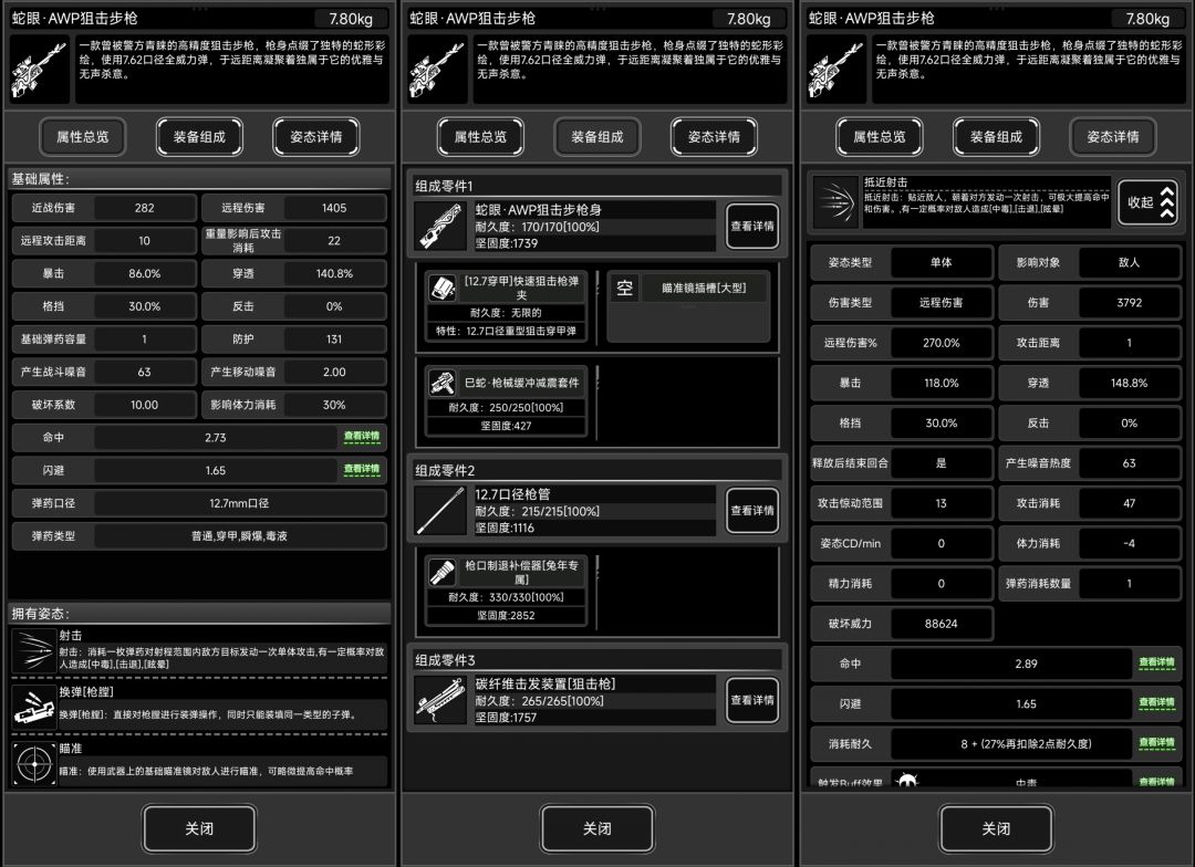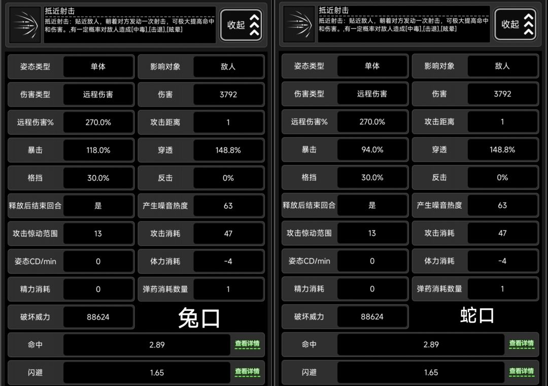 暴击方面兔口比蛇口多24%,由于抵近射击自带高暴击,因此蛇口离满暴就差6%,可以通过喝麦酒接近满暴
